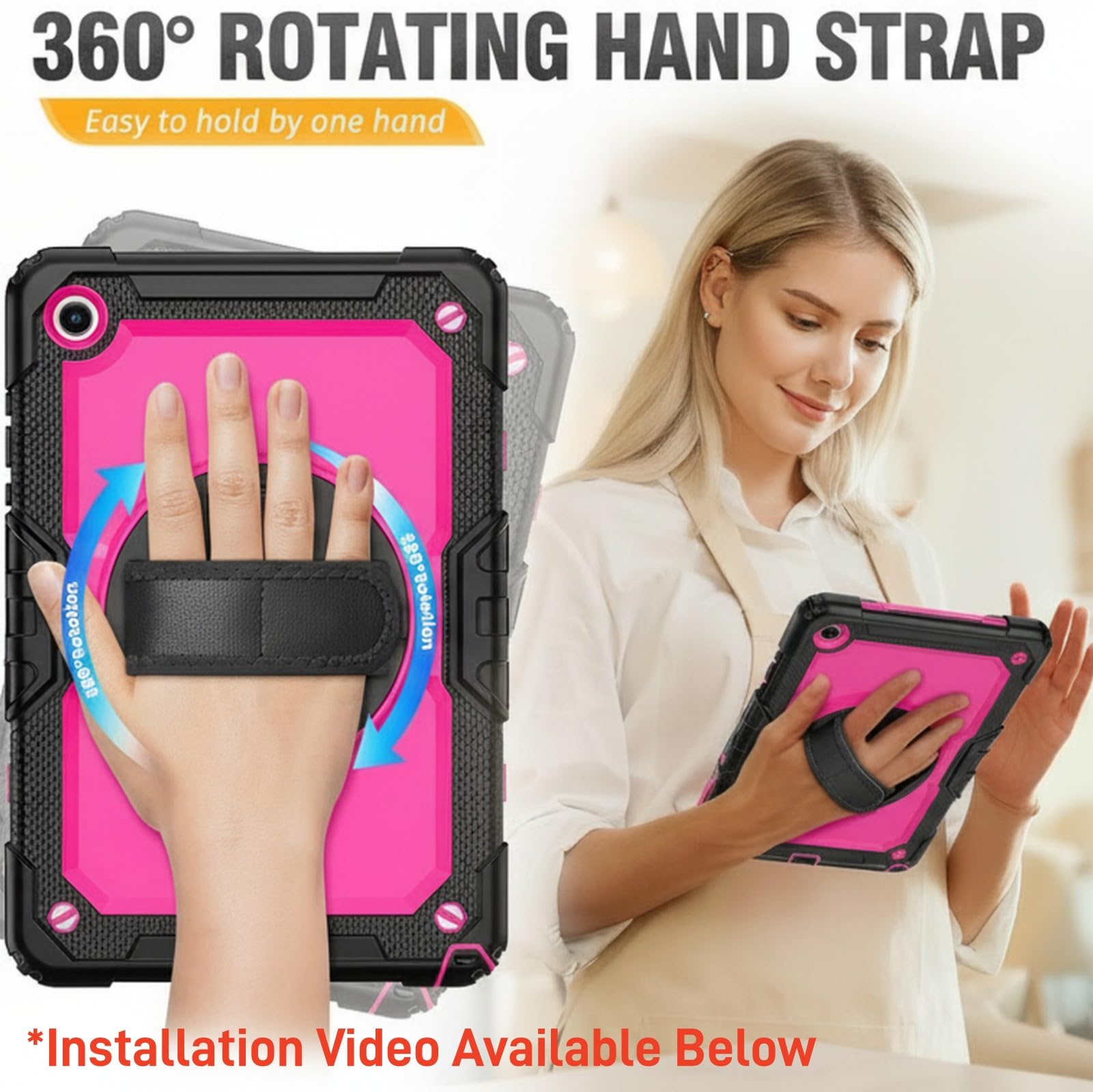 360° Rotating Stand & Hand Strap — The adjustable stand provides a stable support on viewing/drawing/typing angles. The Hand Strap allows you hold it safely by one hand, Perfect for use your tab while lying down or sitting.
