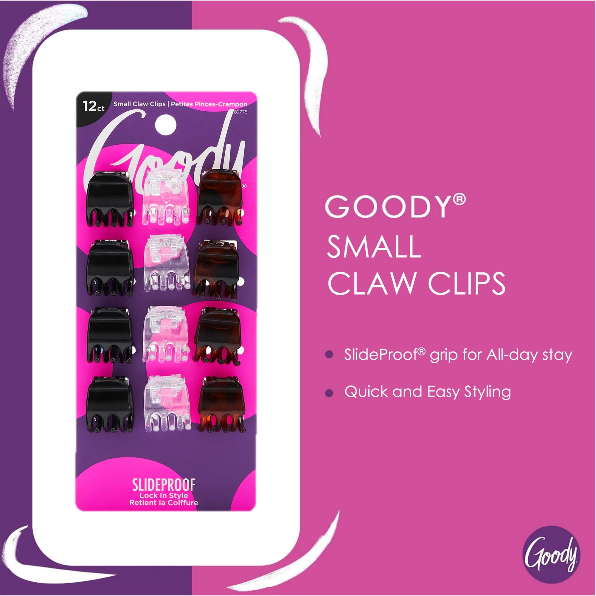 Discover the secret to casual, polished locks with Goody Small Basic Half-Claw Clips. Featuring SlideProof grip, these 3-prong mini claw clips deliver a secure, all-day hold—no slipping, no tugging. With a neutral palette of black, tortoise, and clear finishes, this 12-pack seamlessly matches any look and works beautifully on all hair types. Whether you're crafting a quick half-up do, sectioning your hair for styling, or simply keeping strands in place on busy mornings—these lightweight, compact claw clips are your effortless go-to. From daily wear to travel, Goody ensures comfort, convenience, and confidence in every clip