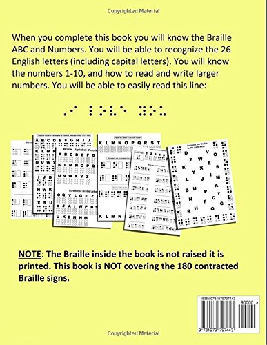 IMPORTANT - THIS IS A PRINTED WORKBOOK FOR THE SIGHTED! NOT RAISED BRAILLE. Easy Step by Step - GRADE 1 PRINTED Braille Tutorial for Beginners! Learn how to write the 26 letters in Braille Alphabet! Recognize each letter and number, know how to write them. THAT'S IT. The book teaches "HOW TO READ & WRITE BRAILLE LETTERS and NUMBERS". Great for novice learners. Write each letter, practice creating the dots at the right place.SIMPLY learning the absolute Alphabet and Numbers basics. This book includes uncontracted Braille - Grade 1!.Lots of practice pages, follow the easy visual study step by step explanations and examples. What is NOT Included in This Book: No Grade 2 Braille contracted pronunciation shortcuts. WHY? Because for beginners it would be so much information, before knowing the basics, how to write the 26 letters and numbers. NOTE - THIS IS NOT a STUDY BOOK FOR BLIND PEOPLE. NOTE - The Braille inside the book is printed NOT raised. Raised Grade 2 BRAILLE alphabet is used by blind people to read. This book can assist family members, friends and those who work with people that have vision impairment to learn the basics of Braille. Studying BRAILLE code alphabet chart requires to practice! This book includes dozens of practicing pages to help you practice writing the Braille grade one alphabet, until you can read the letters easily.