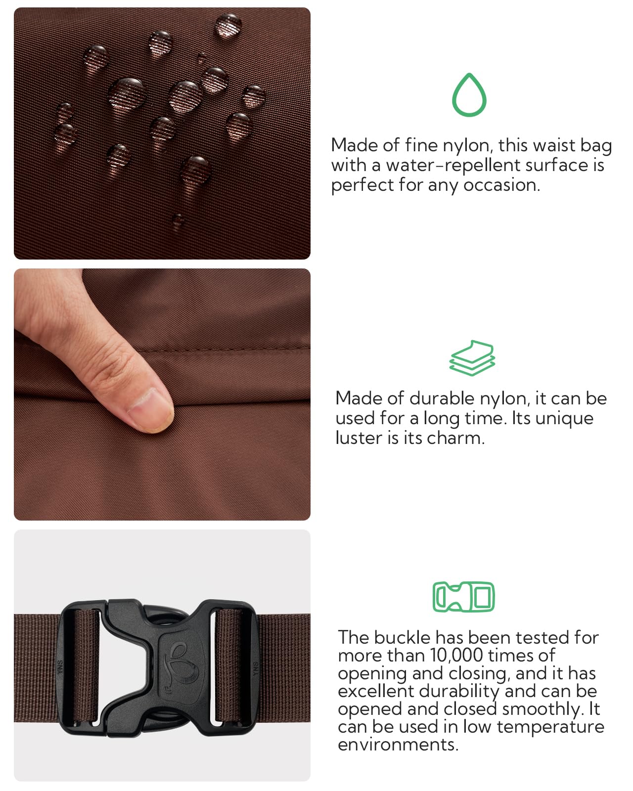 Premium Material & Sturdy SBS Zipper: Hiking waist bag is made of high-quality nylon material, durable and breathable, fine workmanship and tight stitching. Smooth zippers ensure users to quick access to the items, preventing items from falling