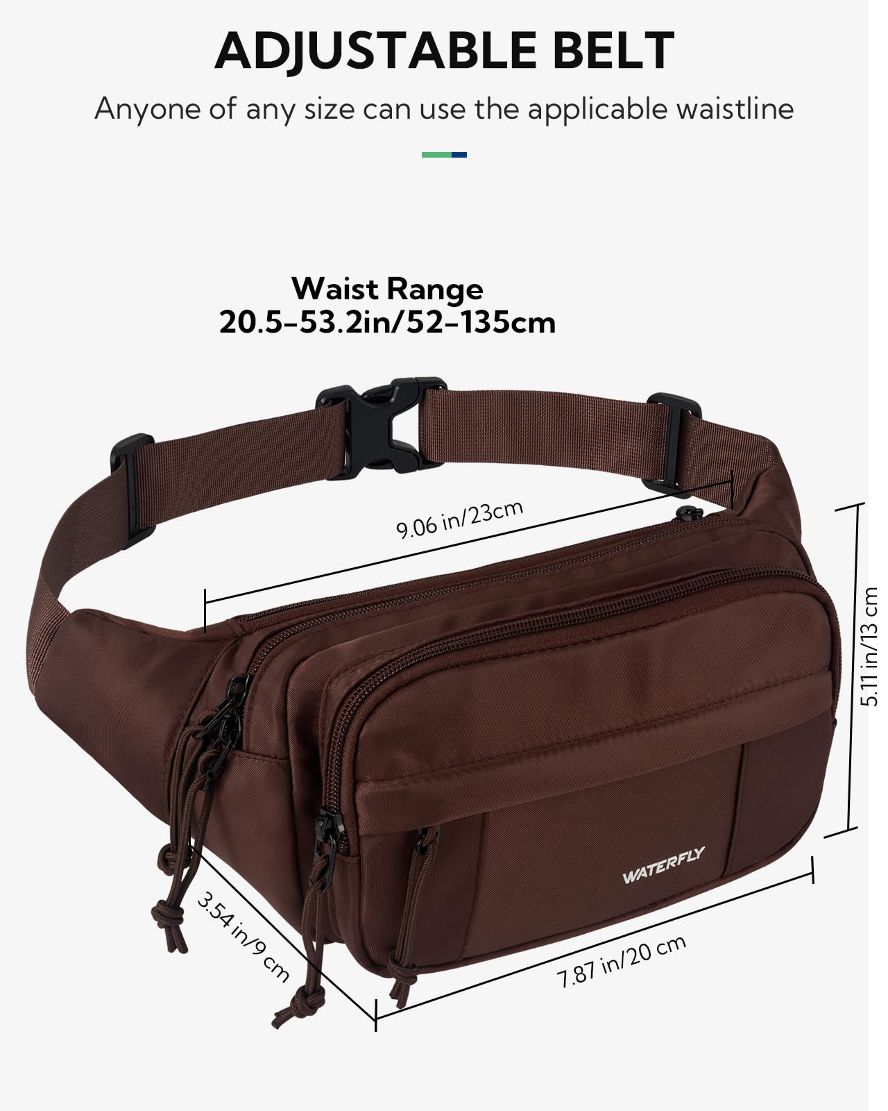 Roomy & Adjustable Strap: The size of large waist pack is 9.06 x 5.11 x 3.54 in, it can hold your mobile phone, cards, cash, passport and umbrella, meets all your storage need. A flexible strap ranges from 31.49-49.21 in, fit your waist even better