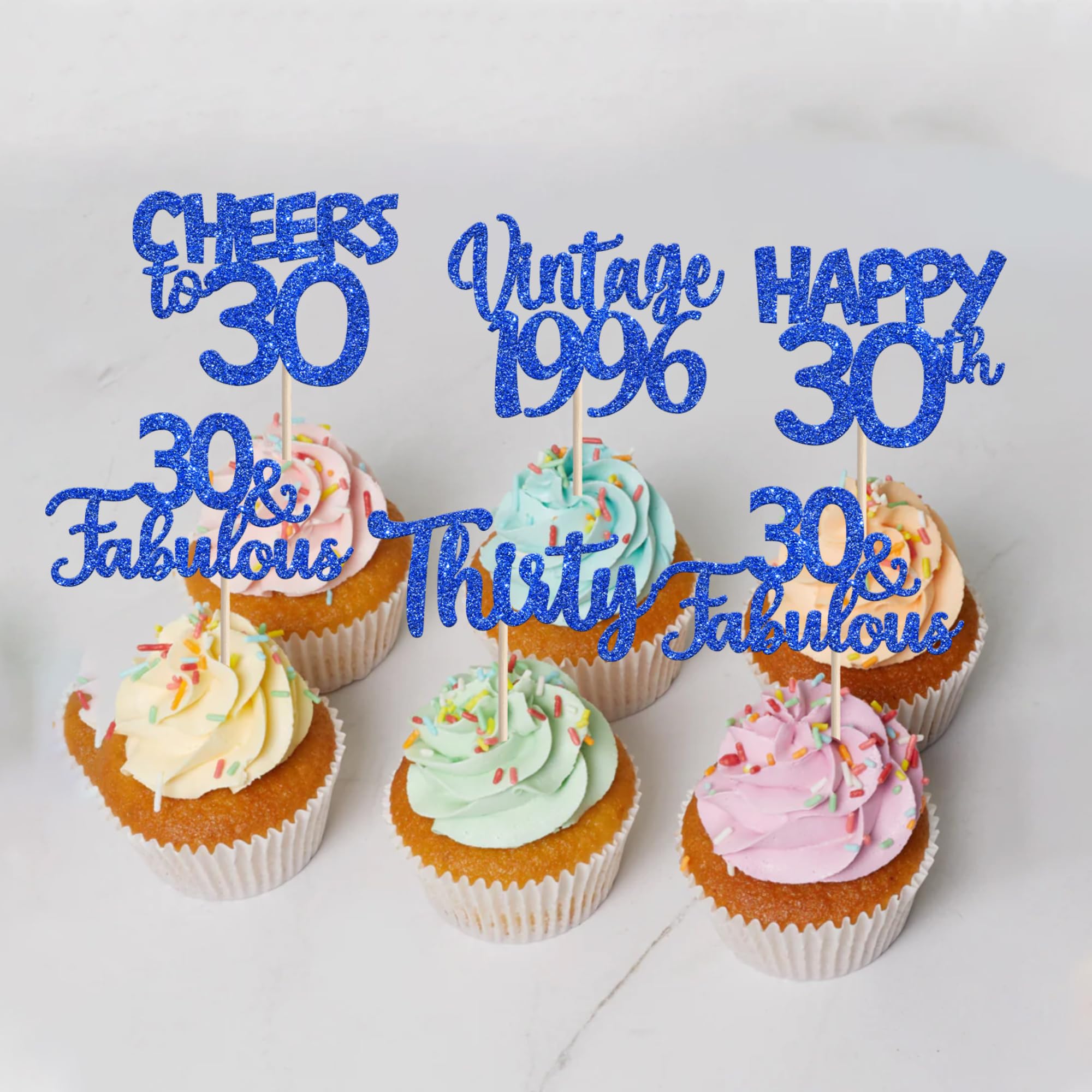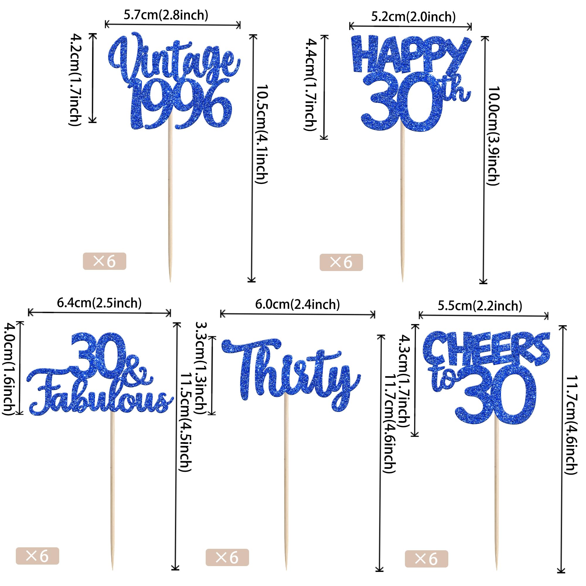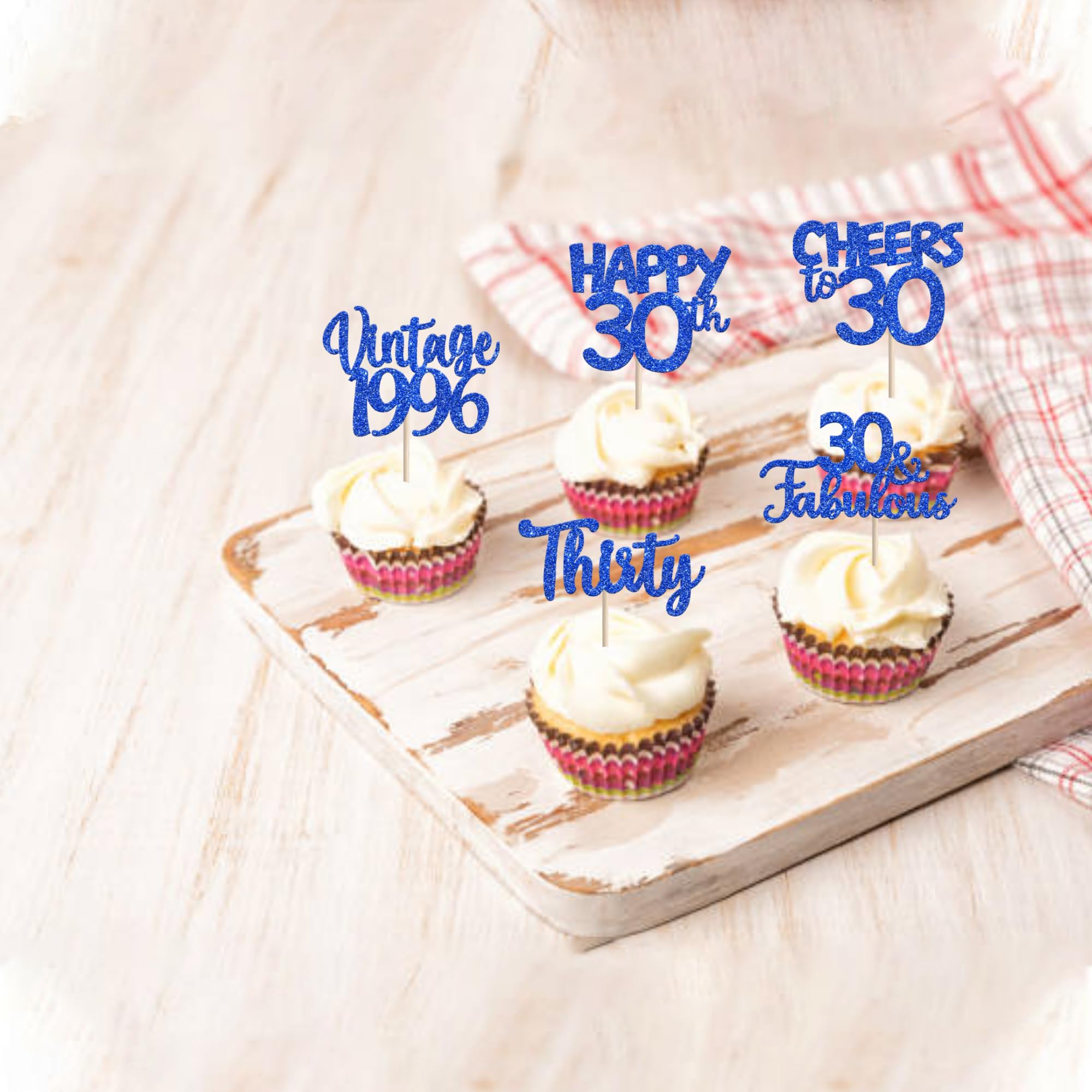 Vintage 1996 Theme 30th Birthday Party Cupcake Decorations Perfect for vintage 1996 theme party, 30th birthday theme party, 30th wedding anniversary theme party,cheers to 30 years theme party cupcake decorations supplies. Pack of 30 pcs,6 pcs of each design The size is 2.8*4.1/ 2.0*3.9/ 2.5*4.5/ 2.4*4.6/ 2.2*4.6 inch ( with stick ) Made of high quality paper card stock,thick and thick and sturdy. These vintage 1996 cupcake toppers are single glitter, the back is white, and they are intended for decoration only, please do not put them in oven or microwave. If the item you received has any defects, please contact us immediately.we will deal with it within 24 hours.