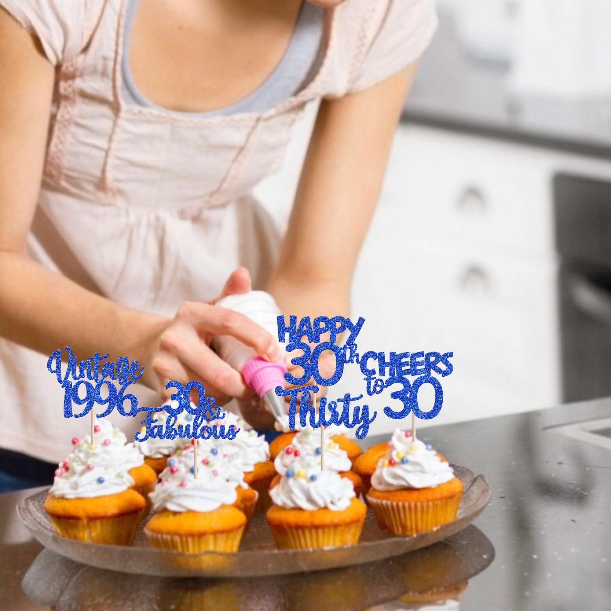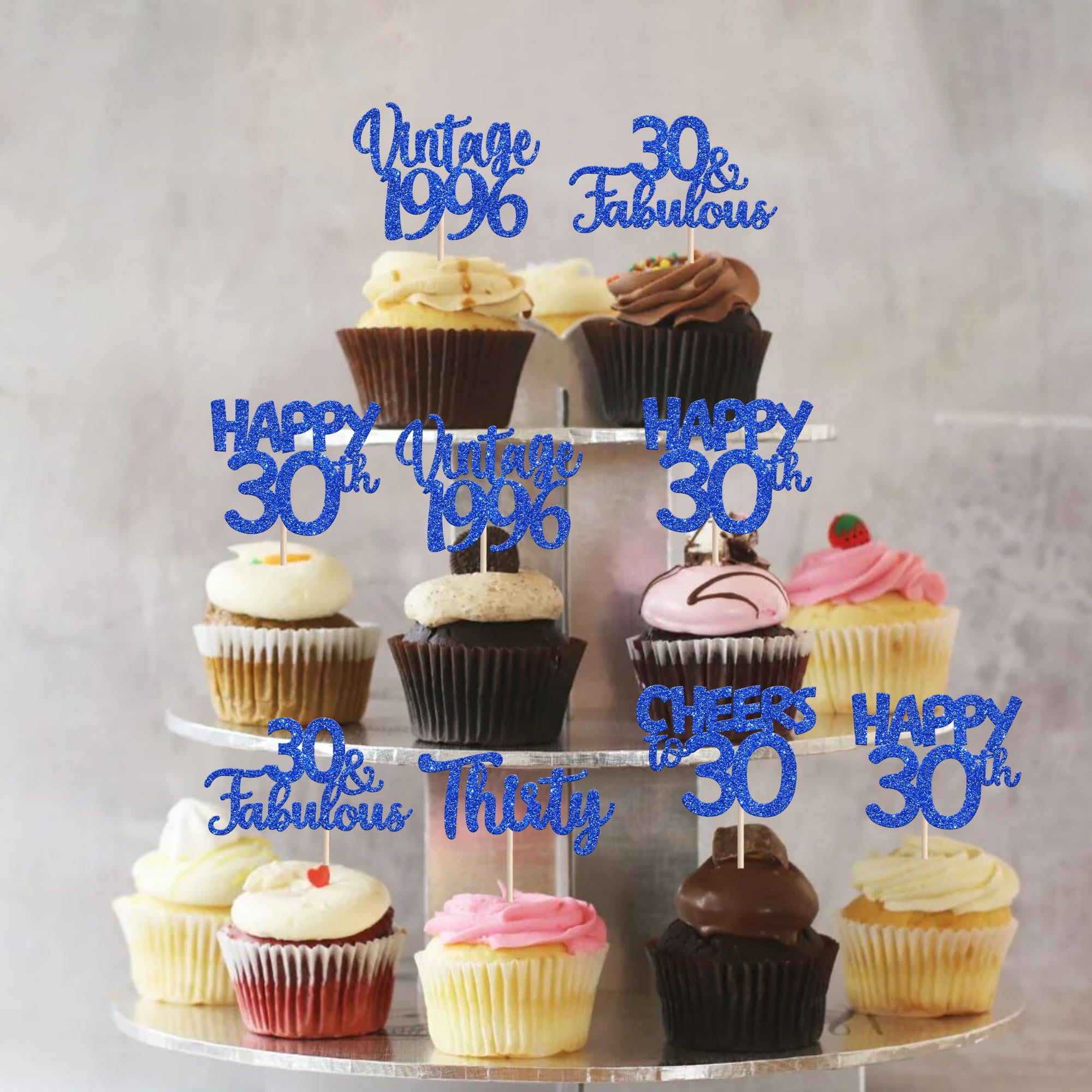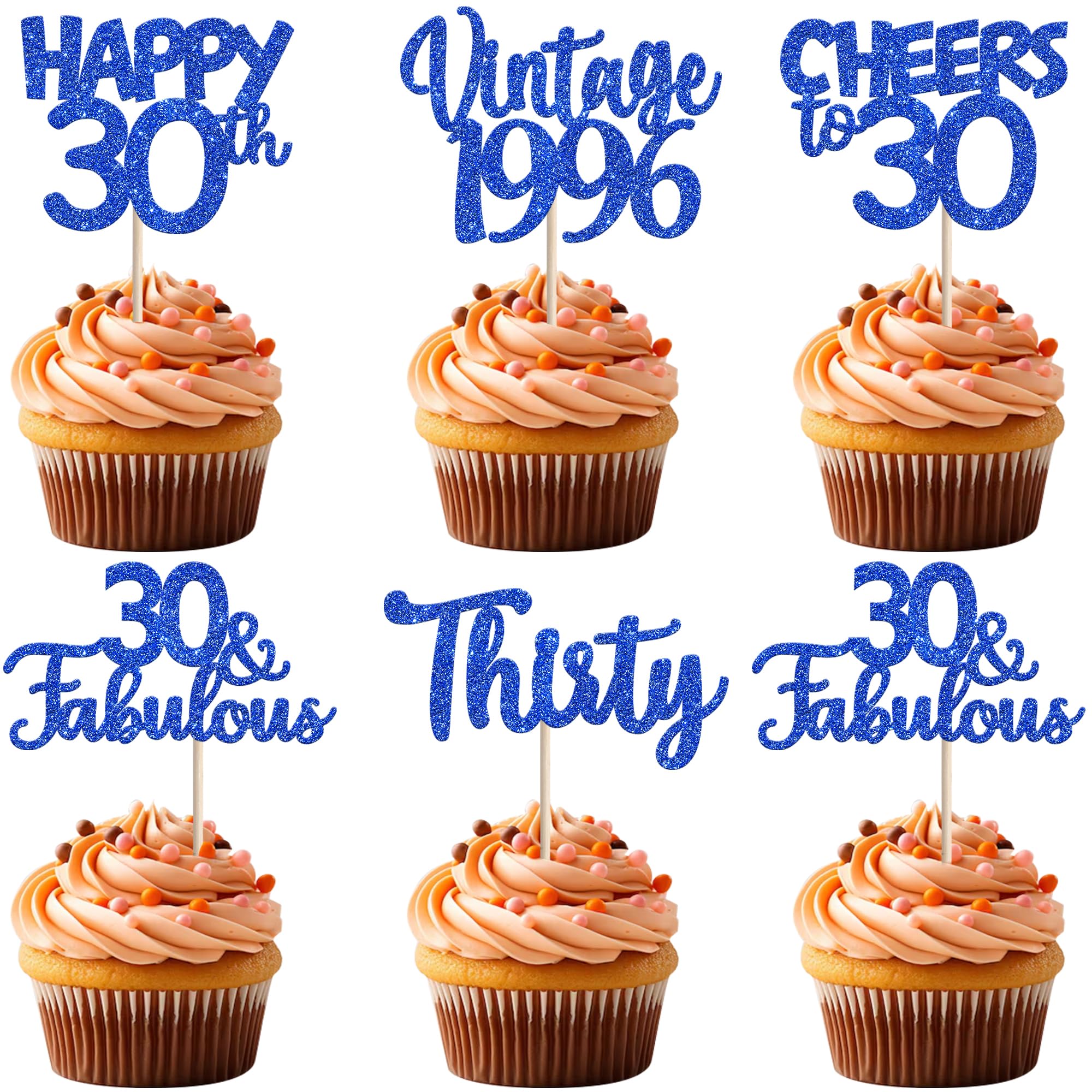Vintage 1996 Theme 30th Birthday Party Cupcake Decorations Perfect for vintage 1996 theme party, 30th birthday theme party, 30th wedding anniversary theme party,cheers to 30 years theme party cupcake decorations supplies. Pack of 30 pcs,6 pcs of each design The size is 2.8*4.1/ 2.0*3.9/ 2.5*4.5/ 2.4*4.6/ 2.2*4.6 inch ( with stick ) Made of high quality paper card stock,thick and thick and sturdy. These vintage 1996 cupcake toppers are single glitter, the back is white, and they are intended for decoration only, please do not put them in oven or microwave. If the item you received has any defects, please contact us immediately.we will deal with it within 24 hours.