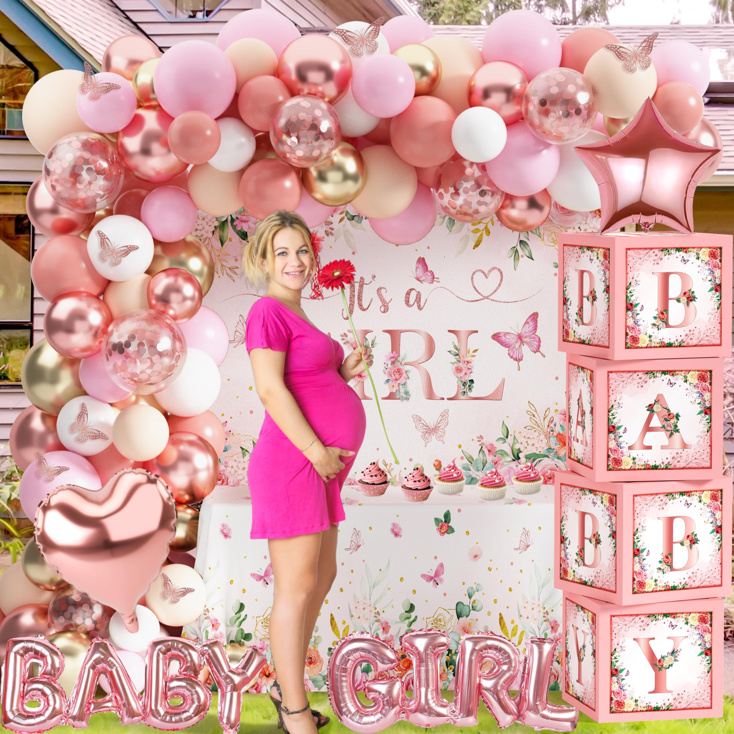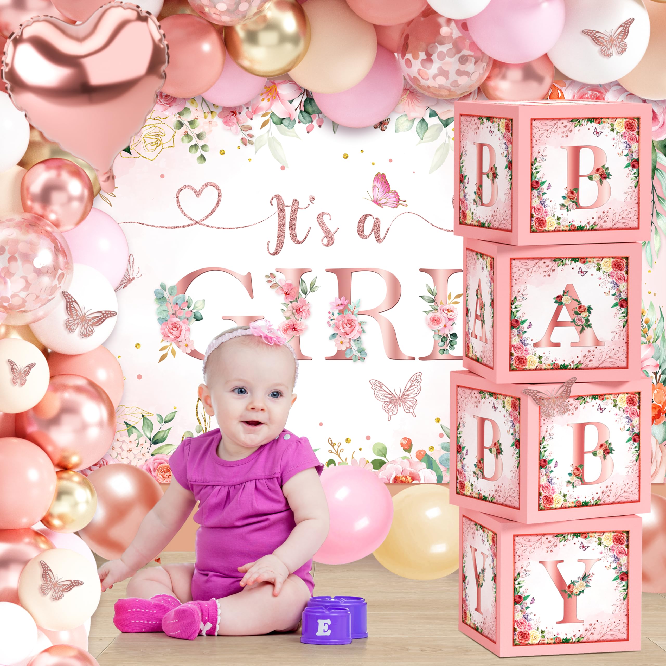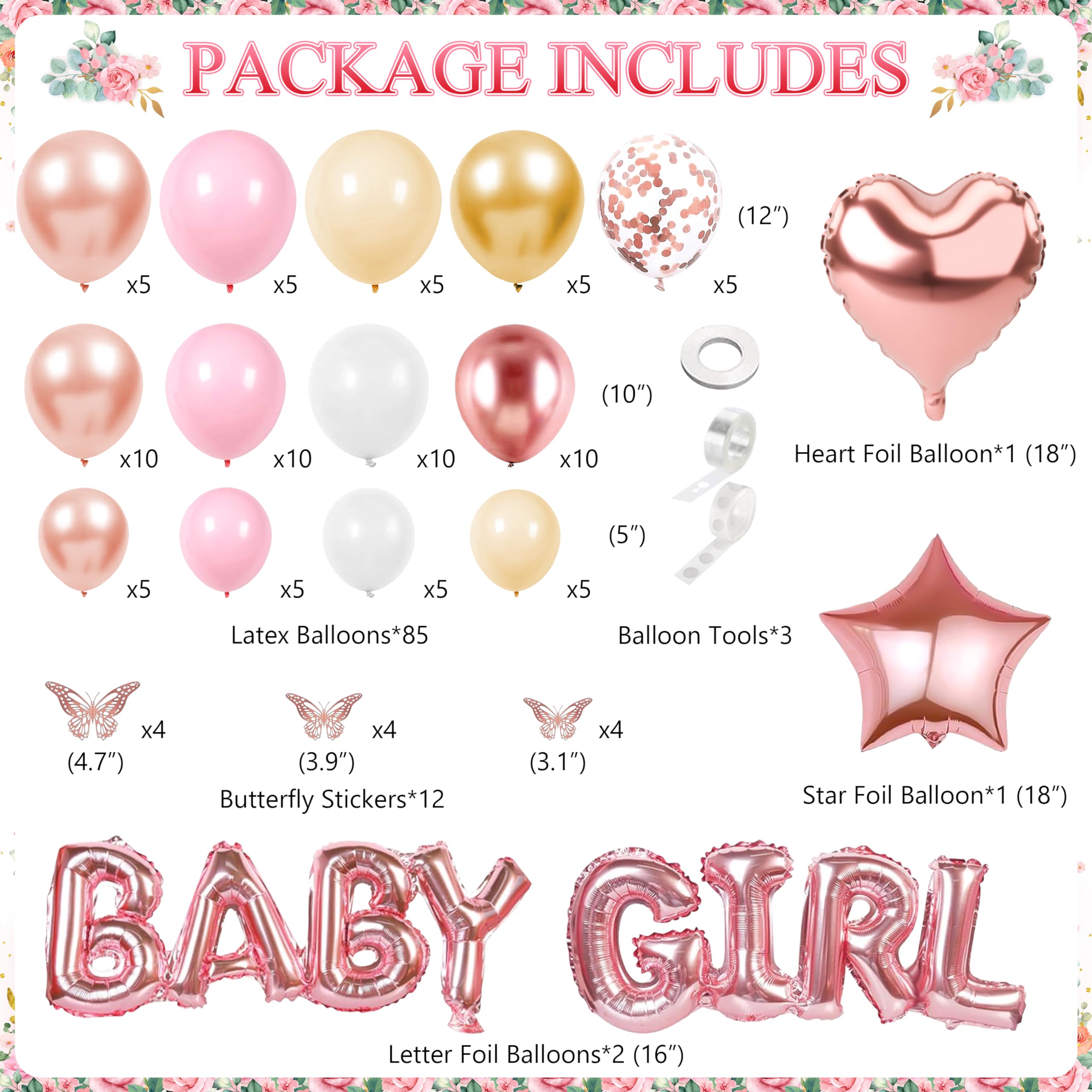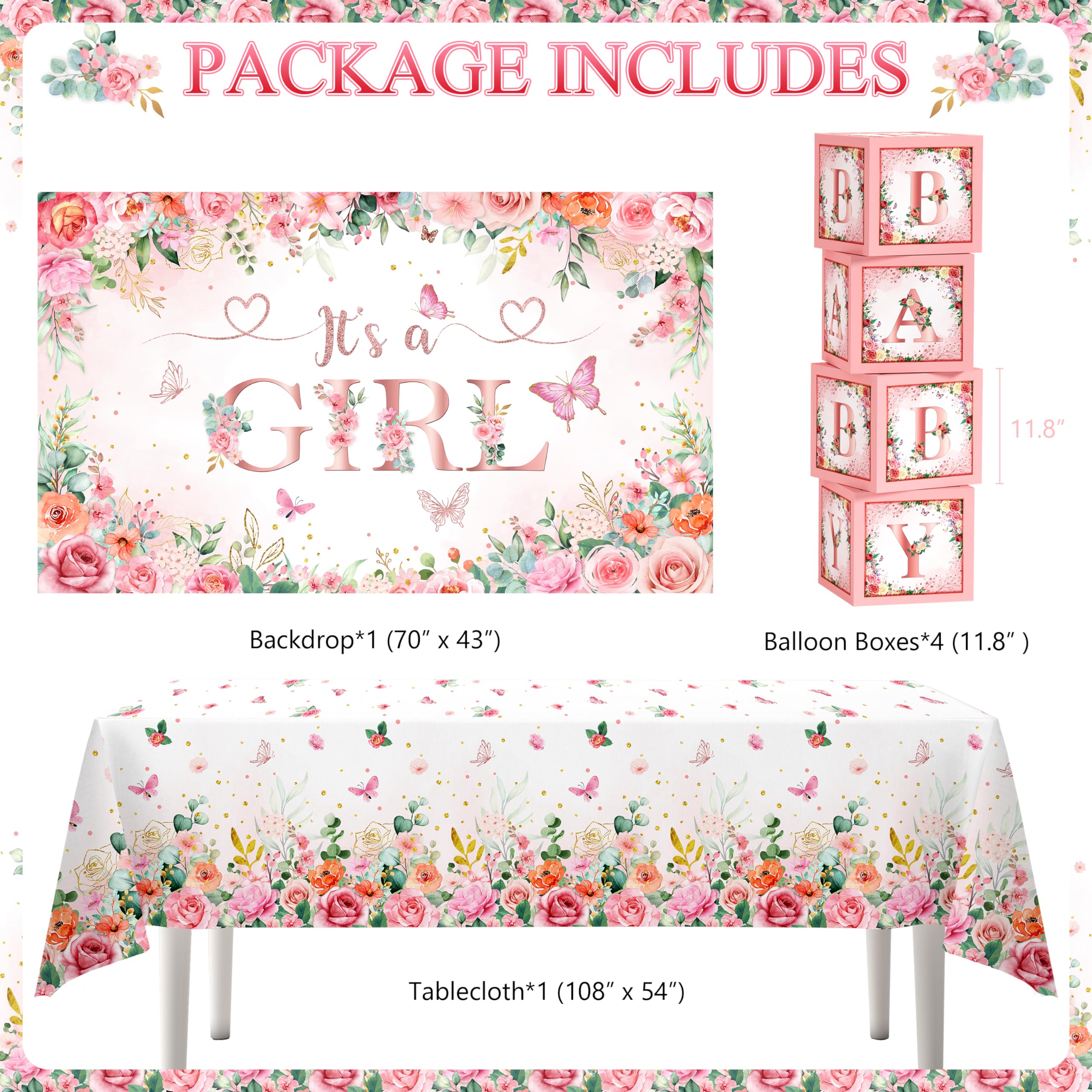 Baby Shower Decorations for Girl -- You will get 1 It's a GIRL backdrop, 1 floral tablecloth, 1 "BABY GIRL"foil balloon, 1 star-shaped foil balloon, 1 heart-shaped foil balloon, 12 3D butterfly stickers, 4 pink baby boxes with letters, 85 latex balloons, 3 tools kit (balloon chain, glue points, ribbon).