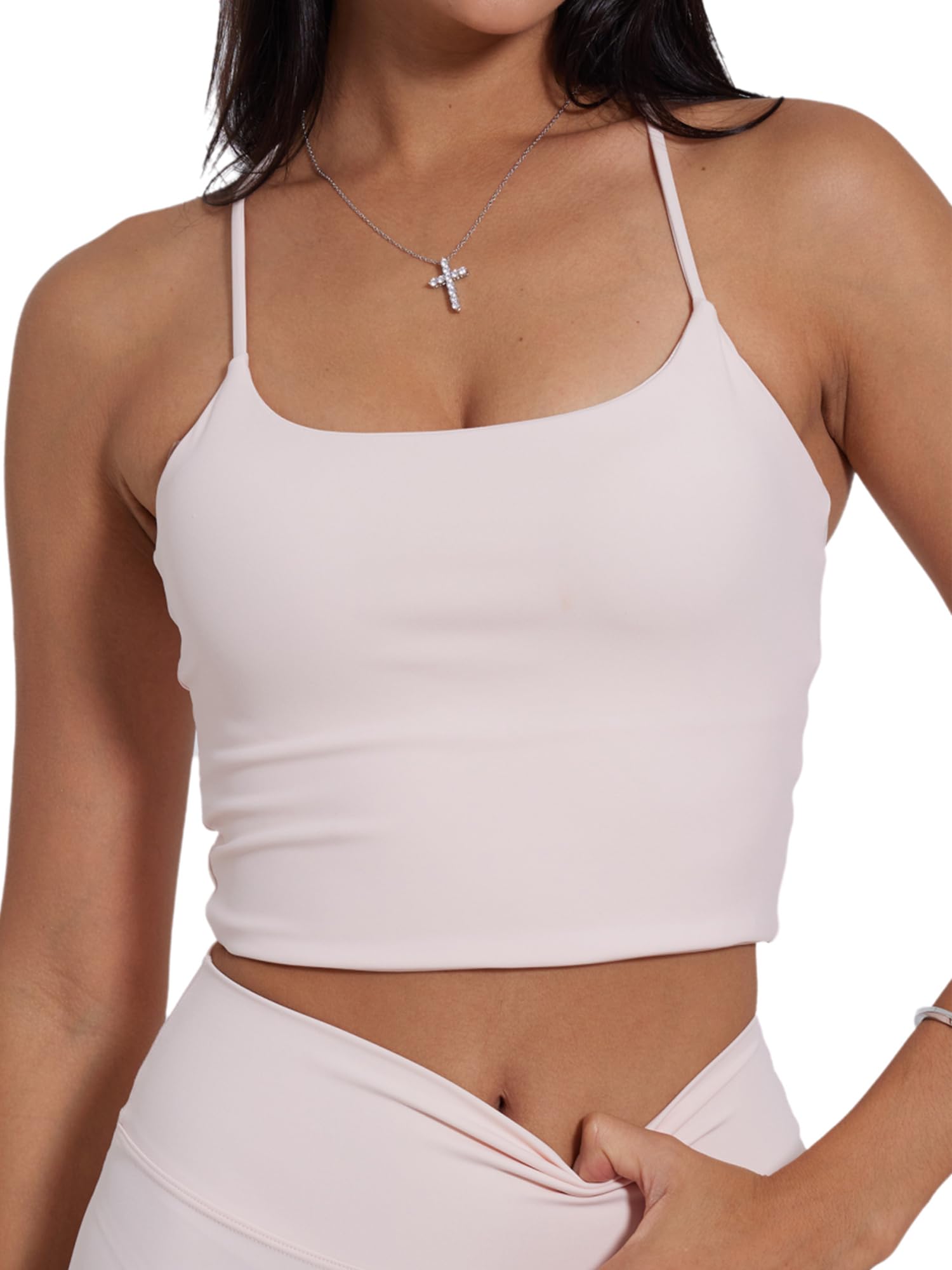 Design & Support: Double layered, mid-length crop tank top with delicate strappy detailing, low scoop front neckline, and low-back spaghetti straps; offers light to medium support with removable padding and built in bra.
