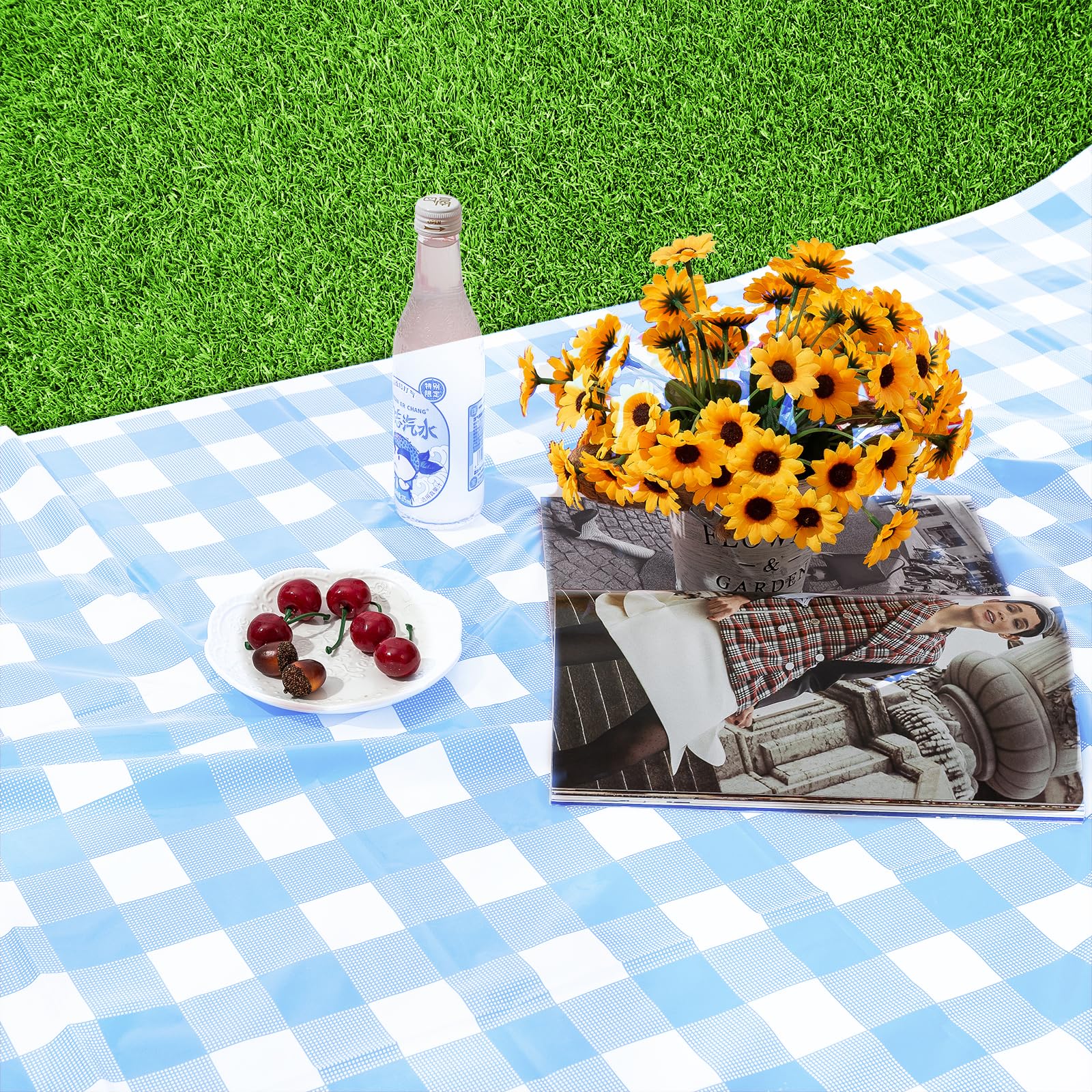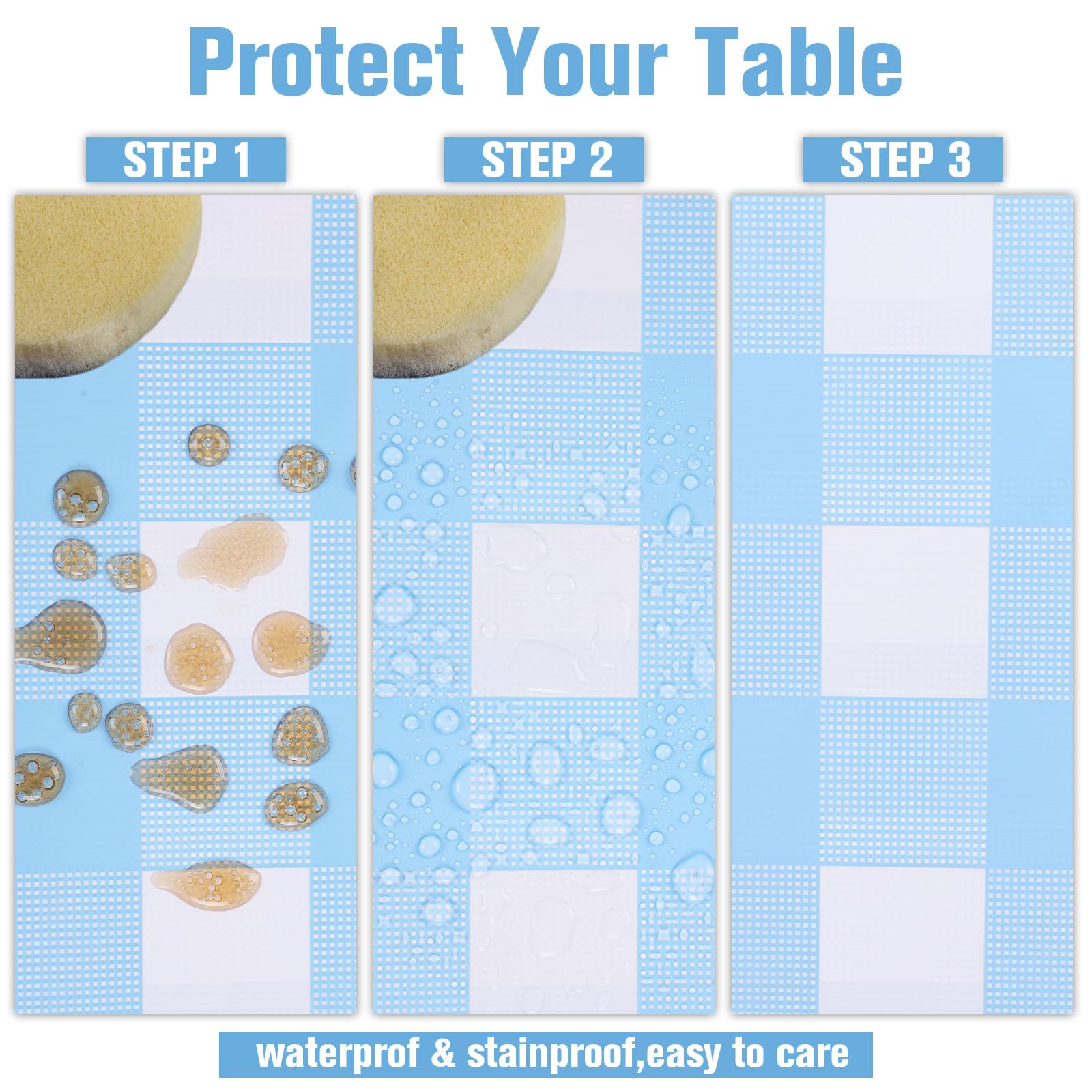 Proper size: The checkered tablecovers measures approximately 54 x 108 inch which perfect for most standard picnic tables and the colors of a bule themed party