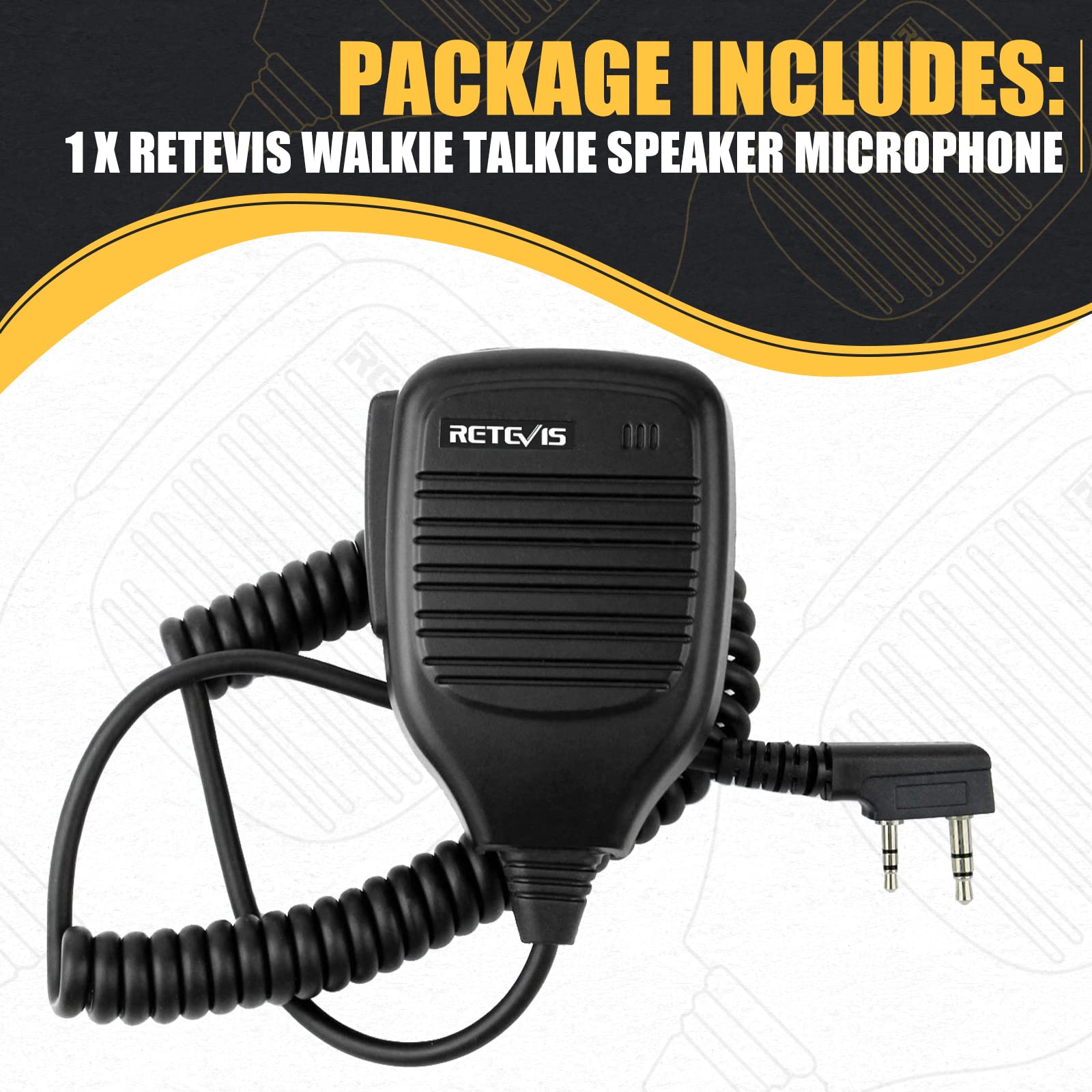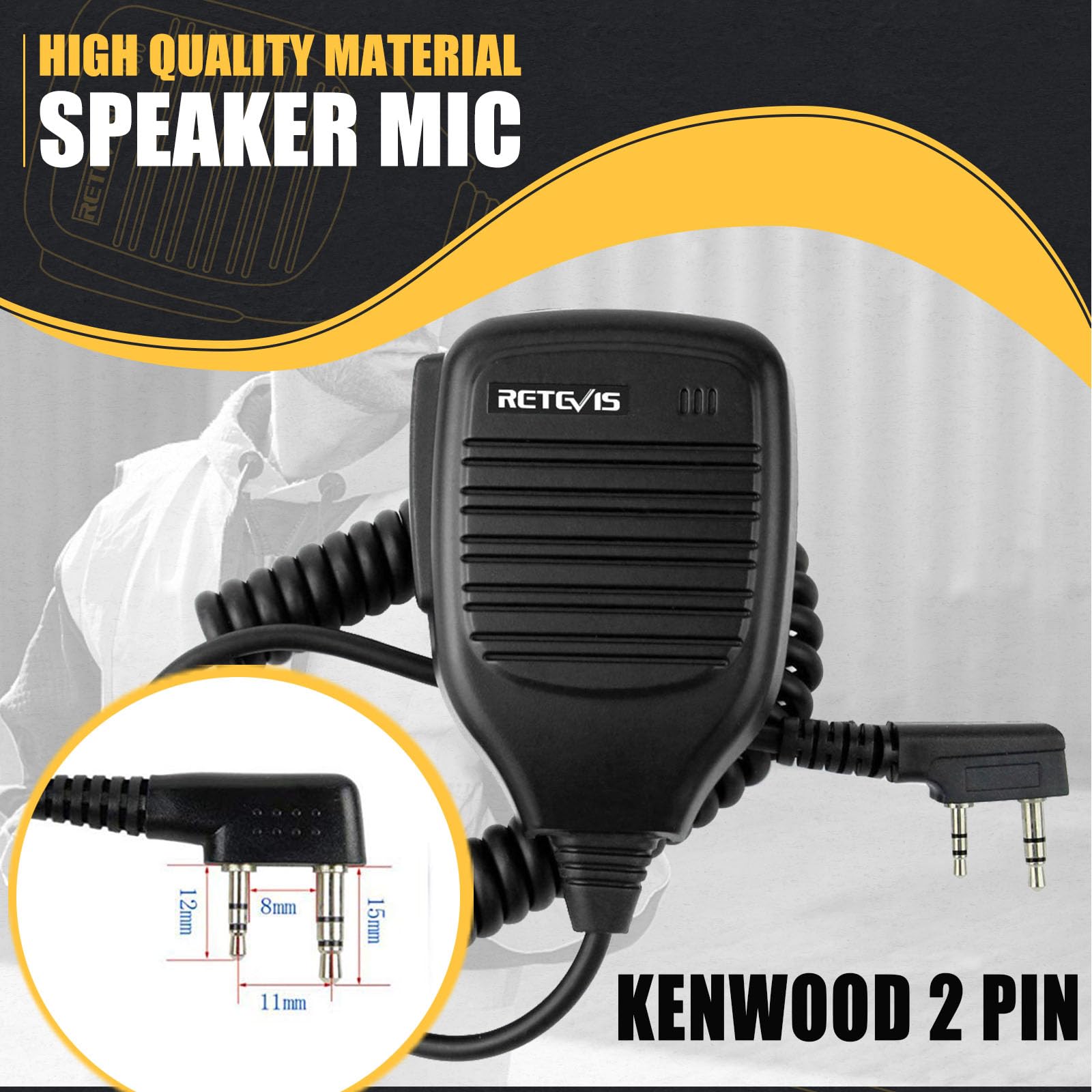 The remote mic speaker with standard 2 pin k head plug type; former pin diameter of 3.5 mm and 2.5 mm in diameter after pin, double pin from 8 mm within; allows work with most brands walkie talkies;but not compatible with Motorola and Midland two way radios