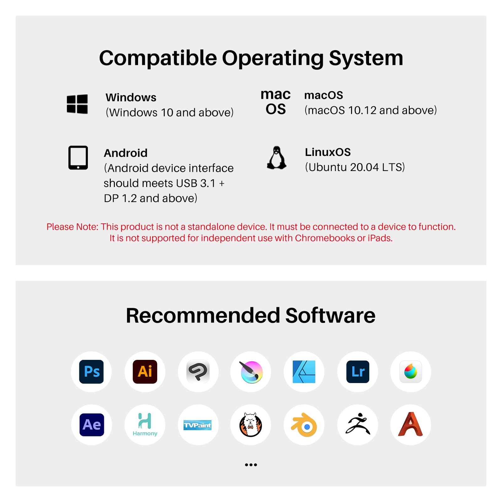 Strong Compatibility: Kamvas 13 (Gen 3) pen display supports a variety of mainstream software. It is compatible with Windows 10 or later, Mac OS 10.12 or later, Android devices that support USB3.1 GEN1 and DP1.2, and Linux OS(Ubuntu 20.04 LTS).