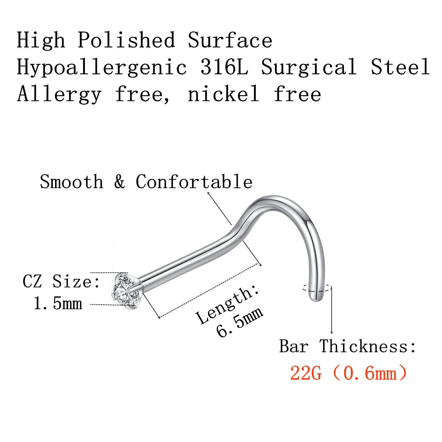 Quantity: 6pcs 1.5mm CZ screw nose rings. This screw nose ring size: Bar thickness: 22 gauge (0.6mm), Pin Length:6.5mm, Prong set cubic zirconia: 1.5mm, These stones a very bright and prong set by hand for accuracy.