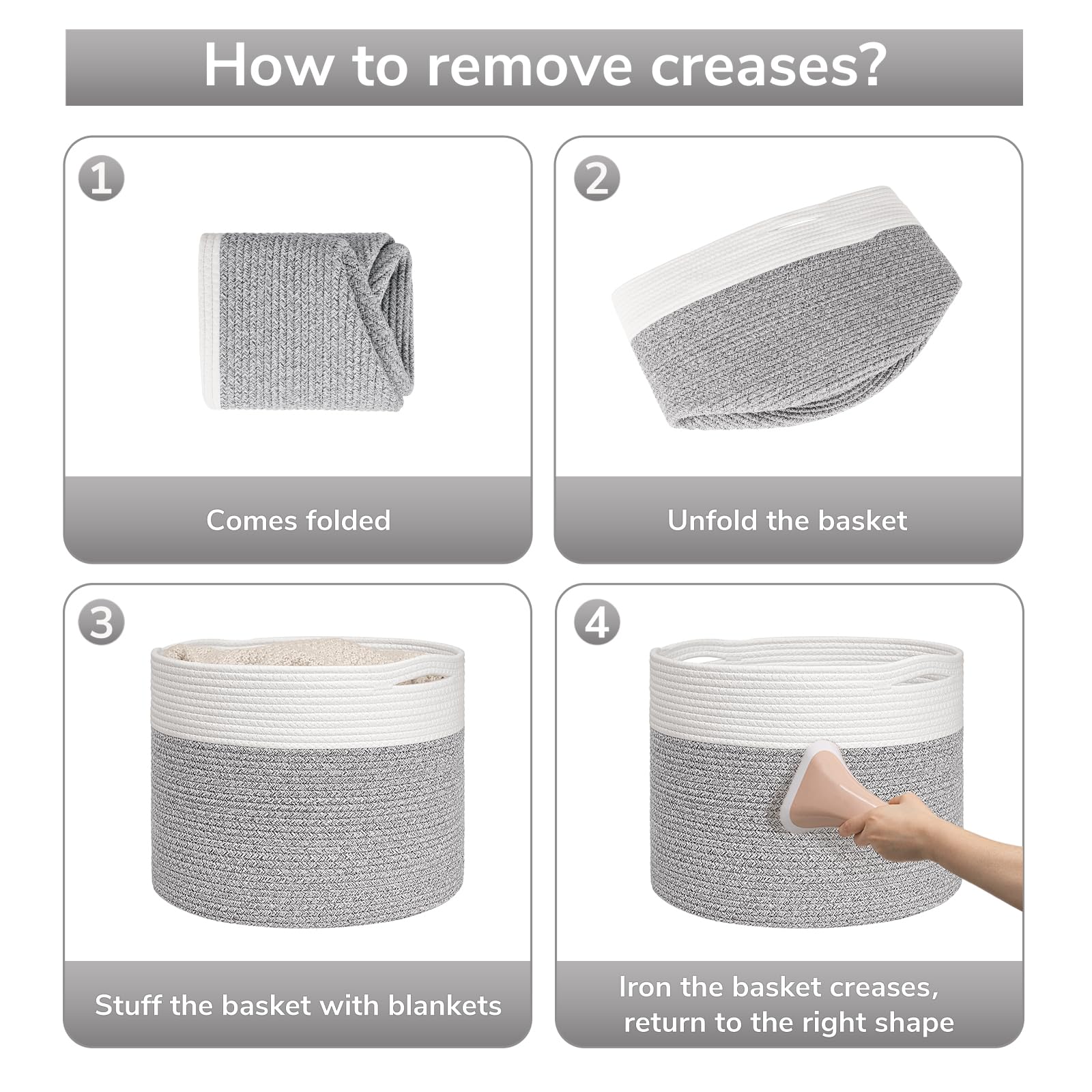 Note: Hand washing or machine washing with gentle detergent. The toy basket comes folded. It’ll return to its best shape while filling blankets and pillows, and ironing is a great idea as well
