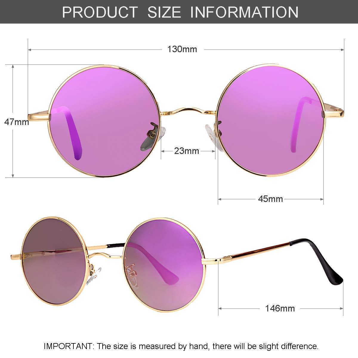 ★ PRODUCT DIMENSION - Lens Width: 45mm (1.77 IN), Frame Height: 47mm (1.85 IN), Nose Bridge: 23mm (0.9 IN), Frame Width: 130mm (5.12 IN), Temple Length: 146mm (5.75 IN). Net Weight: 20g.