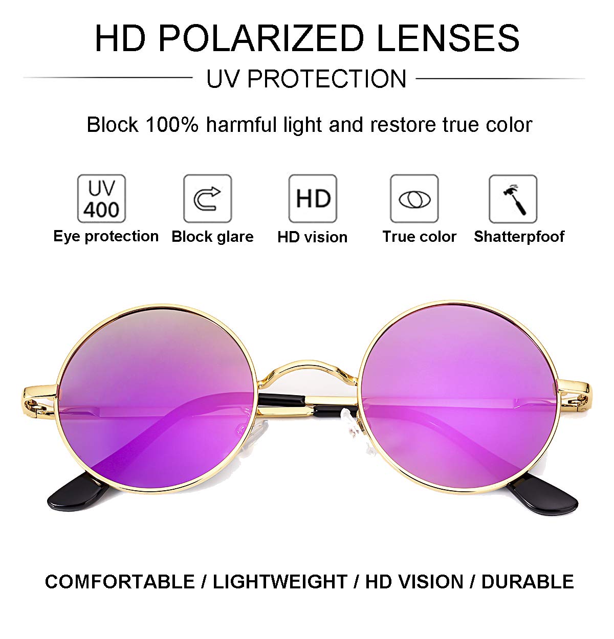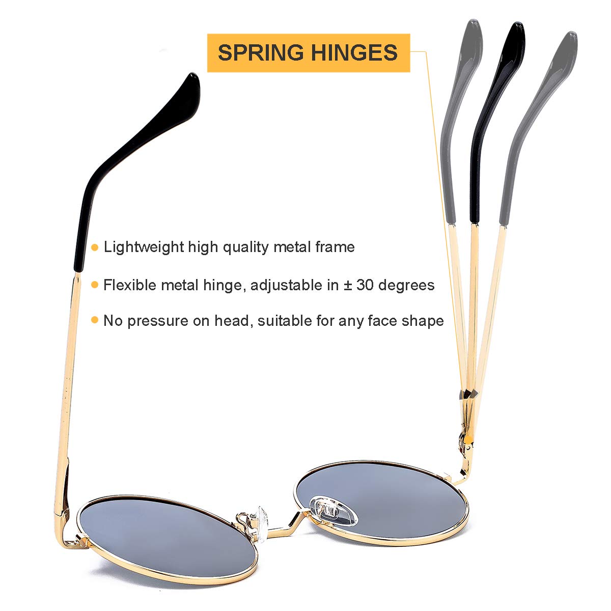 ★ PREMIUM MATERIAL - Scratch-resistant polycarbonate lens with anti-glare coating, delicate lightweight metal frame, soft and anti-skid nose pads, flexible spring hinges, these sun glasses are very sturdy and comfortable.