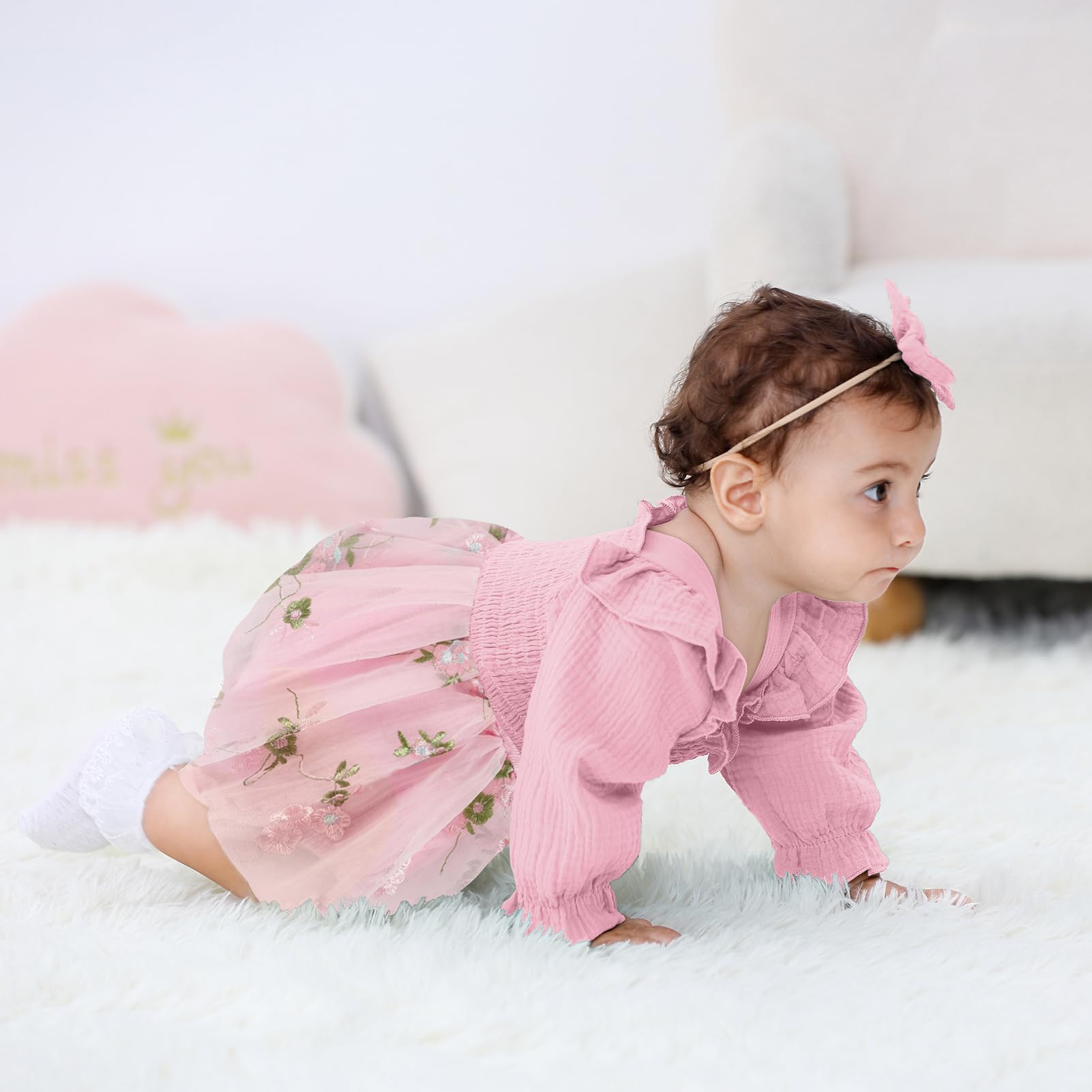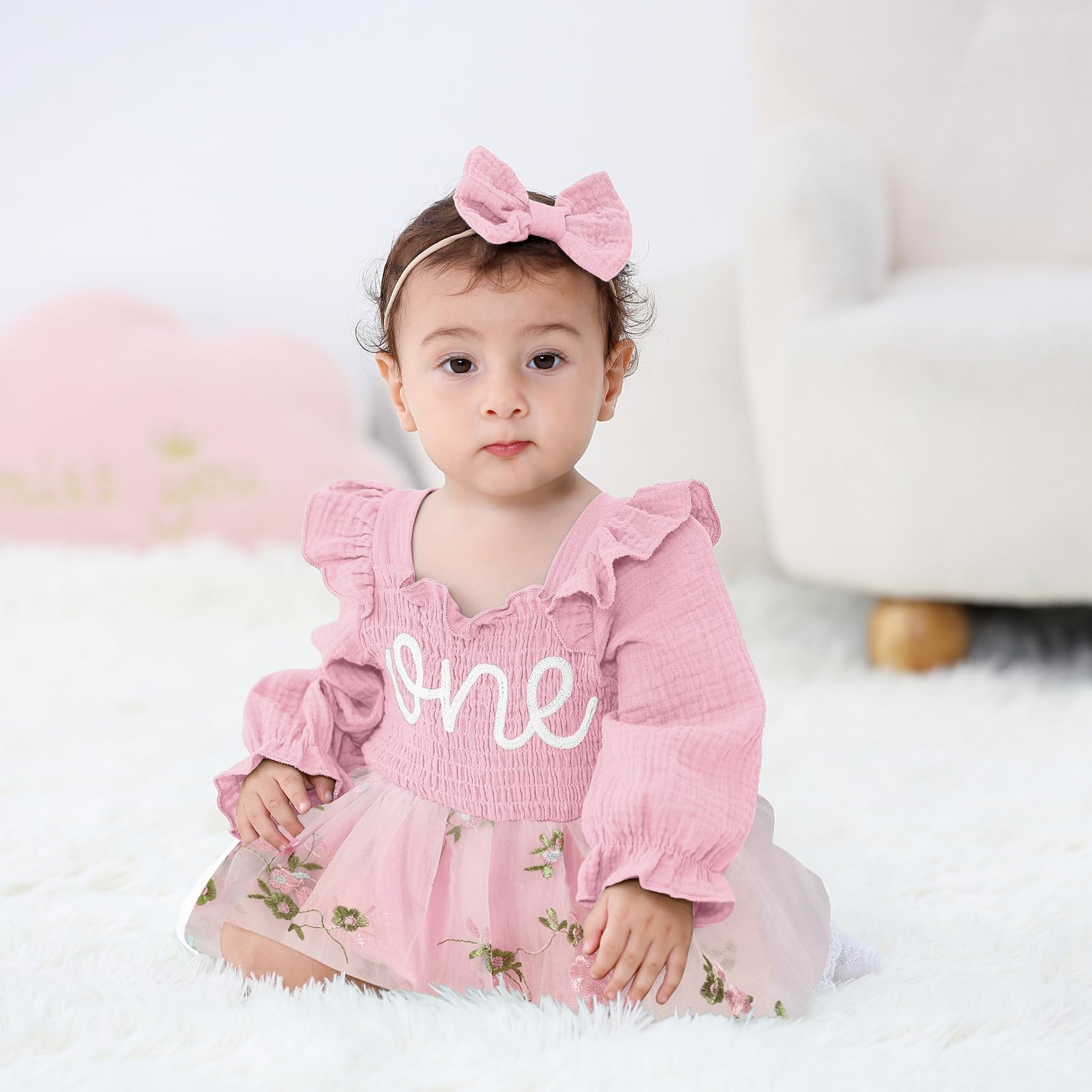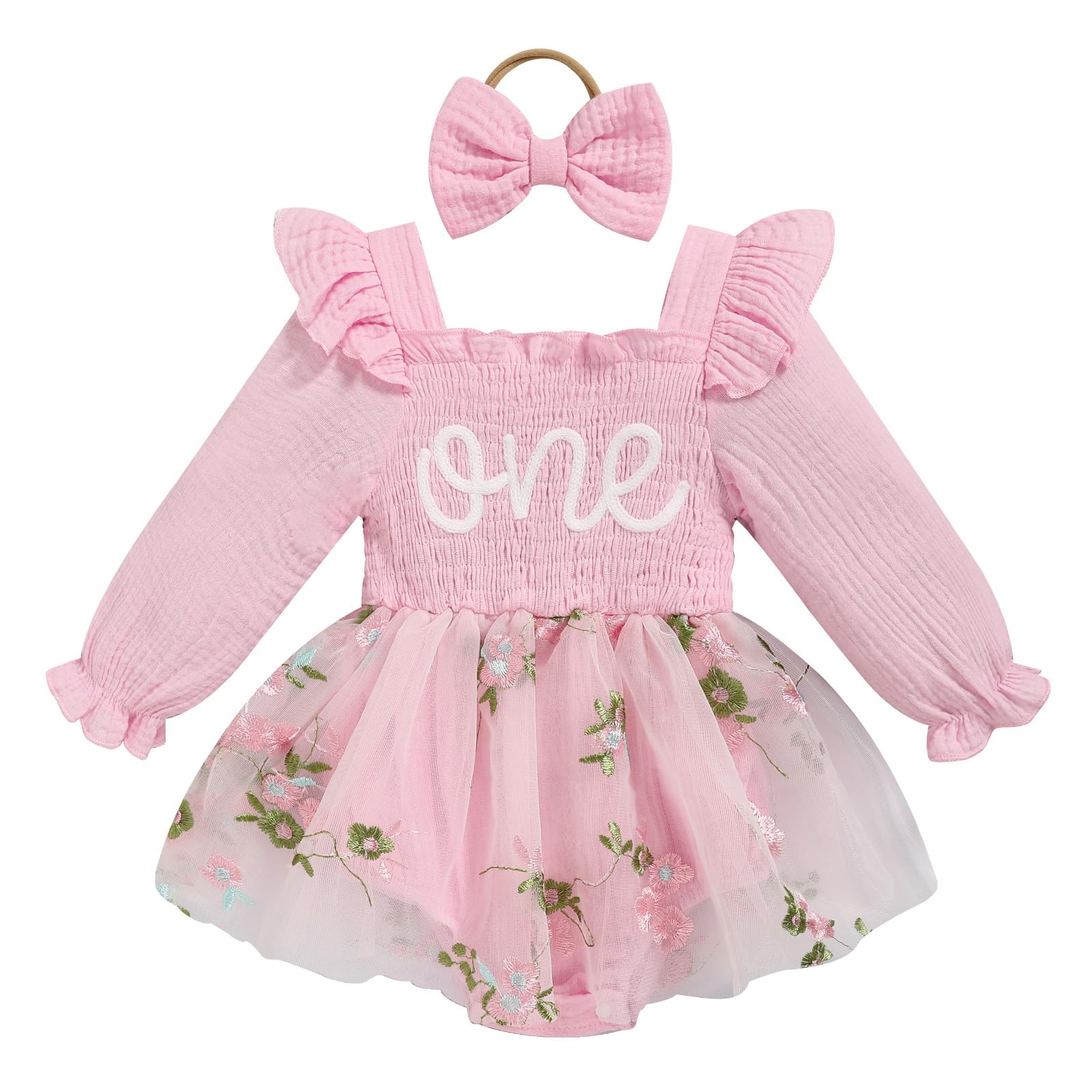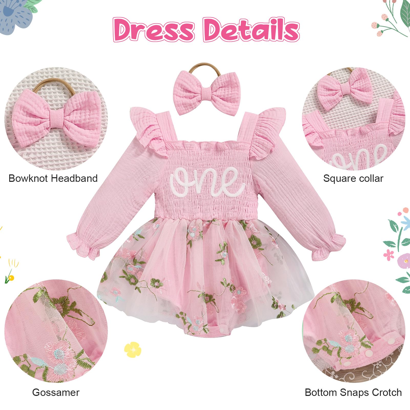 Design: Newborn baby girl playwear romper dress with long sleeve, solid color, multi-layered tulle, Snap leg openings for easy diaper changes, easier morning for novice mother.Cute princess 1st birthday outfit, fashionable and adorable embroidery ONE printed themed birthday clothes perfect for creating beautiful memory of her first birthday.