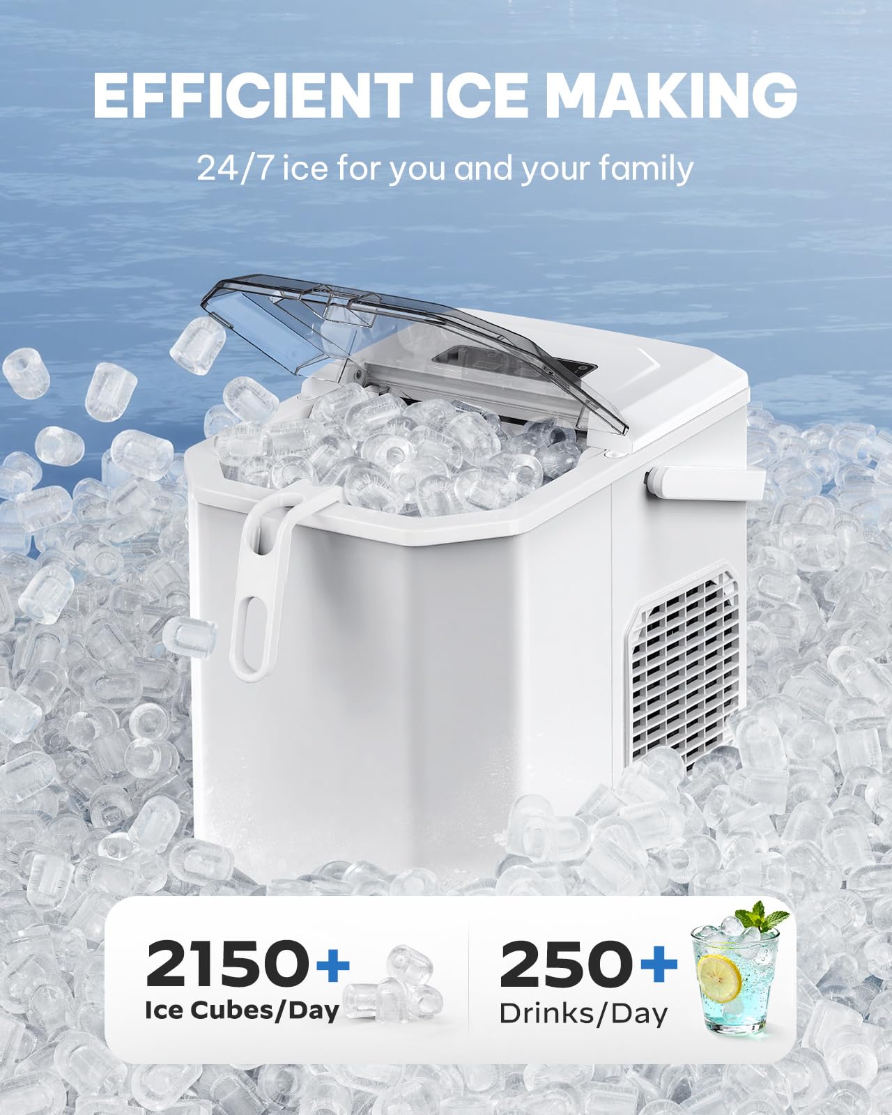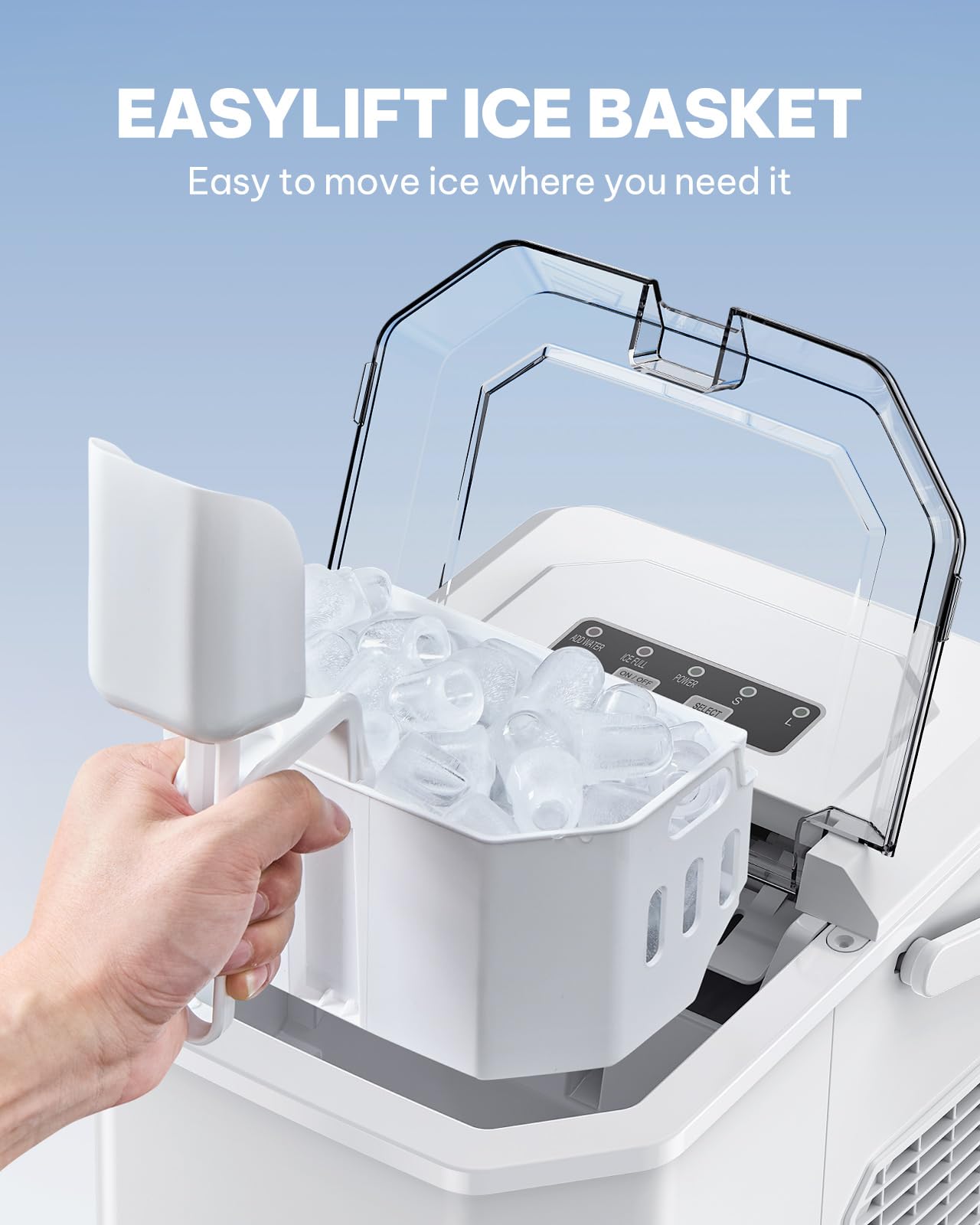 CONVENIENT PORTABLE DESIGN: The sturdy handle makes the ice maker easy to carry, while the scoop attaches to the basket for convenient storage. Weighing just 13.7 lbs, you can take this compact machine room to room or to an event with ease.