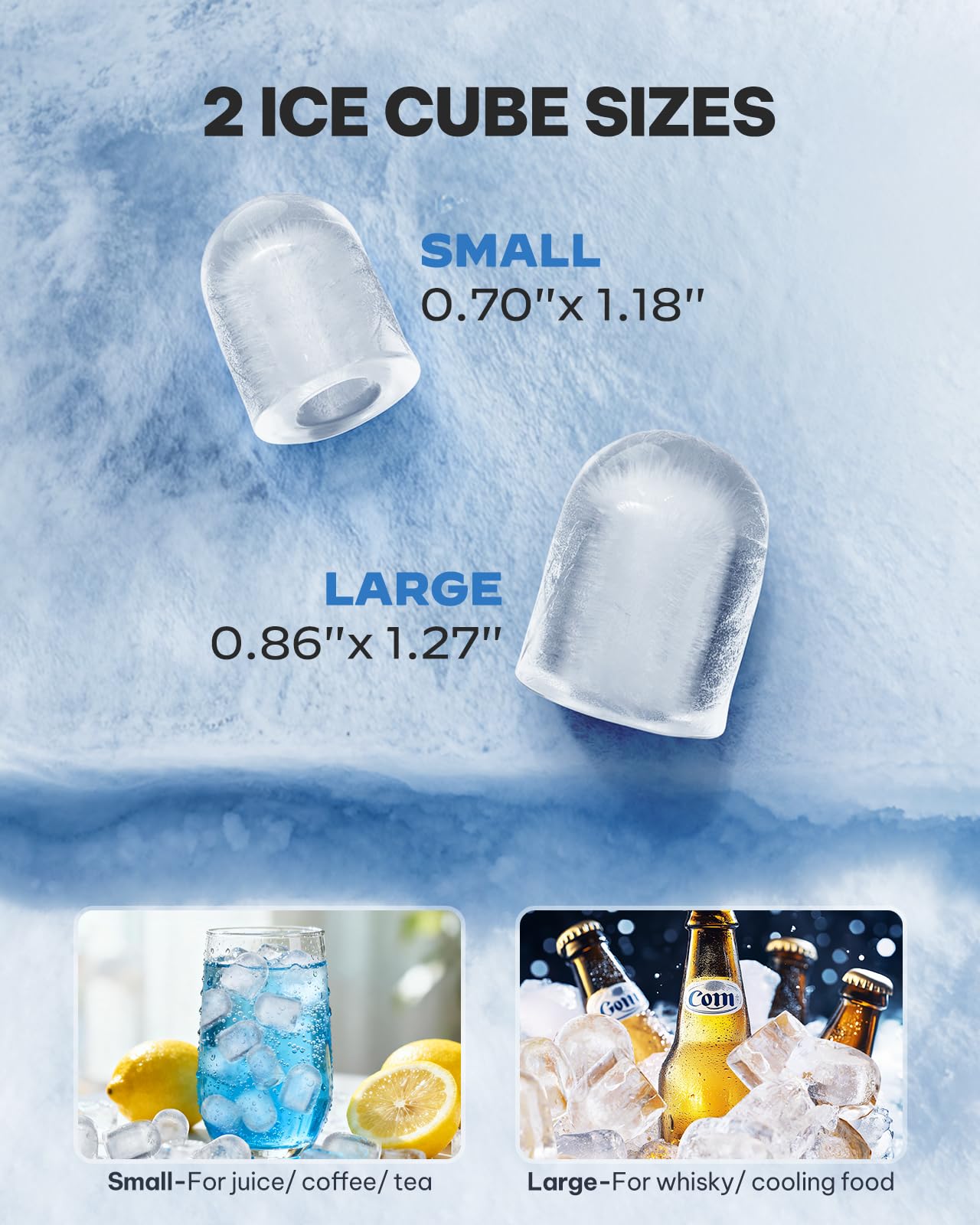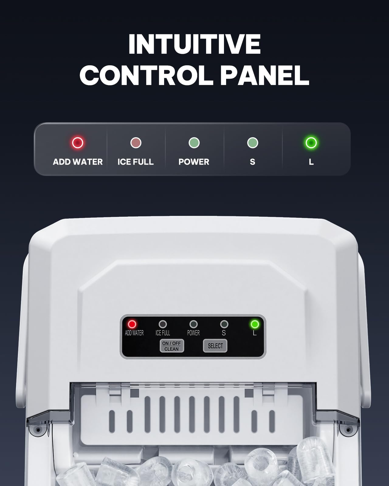 SIMPLE CONTROL PANEL: Enjoy fresh ice with 3 easy steps! Fill the reservoir, switch the unit on, then select small or large ice cubes. The ice maker features an indicator light to notify when water needs to be added or ice is full. Upgrade your home or office with an ice maker that is both fast and easy to use.