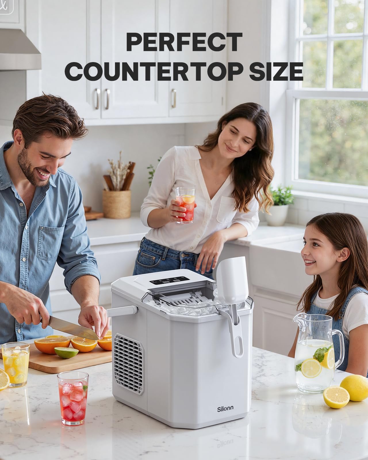 PERFECT COMPACT SIZE: Measuring only 8.7 x 11.4 x 11.6 inches in size, the Silonn ice maker can easily fit on a counter, kitchen island, or desk without taking up too much space. Thanks to the 35db low-noise design, you can run the machine without loud distraction.