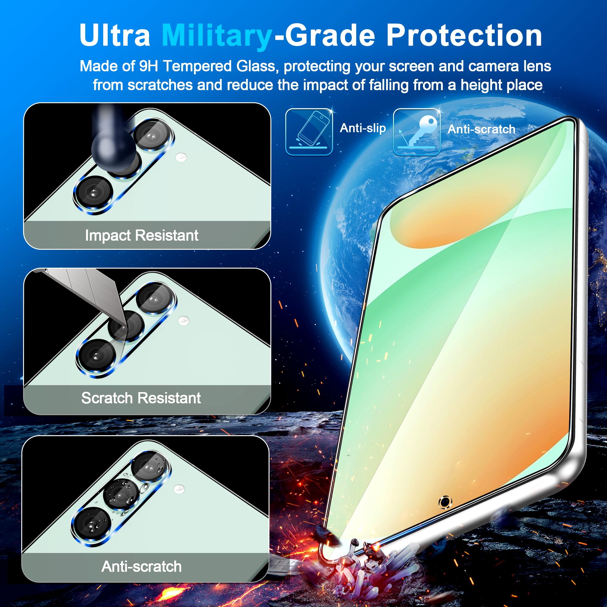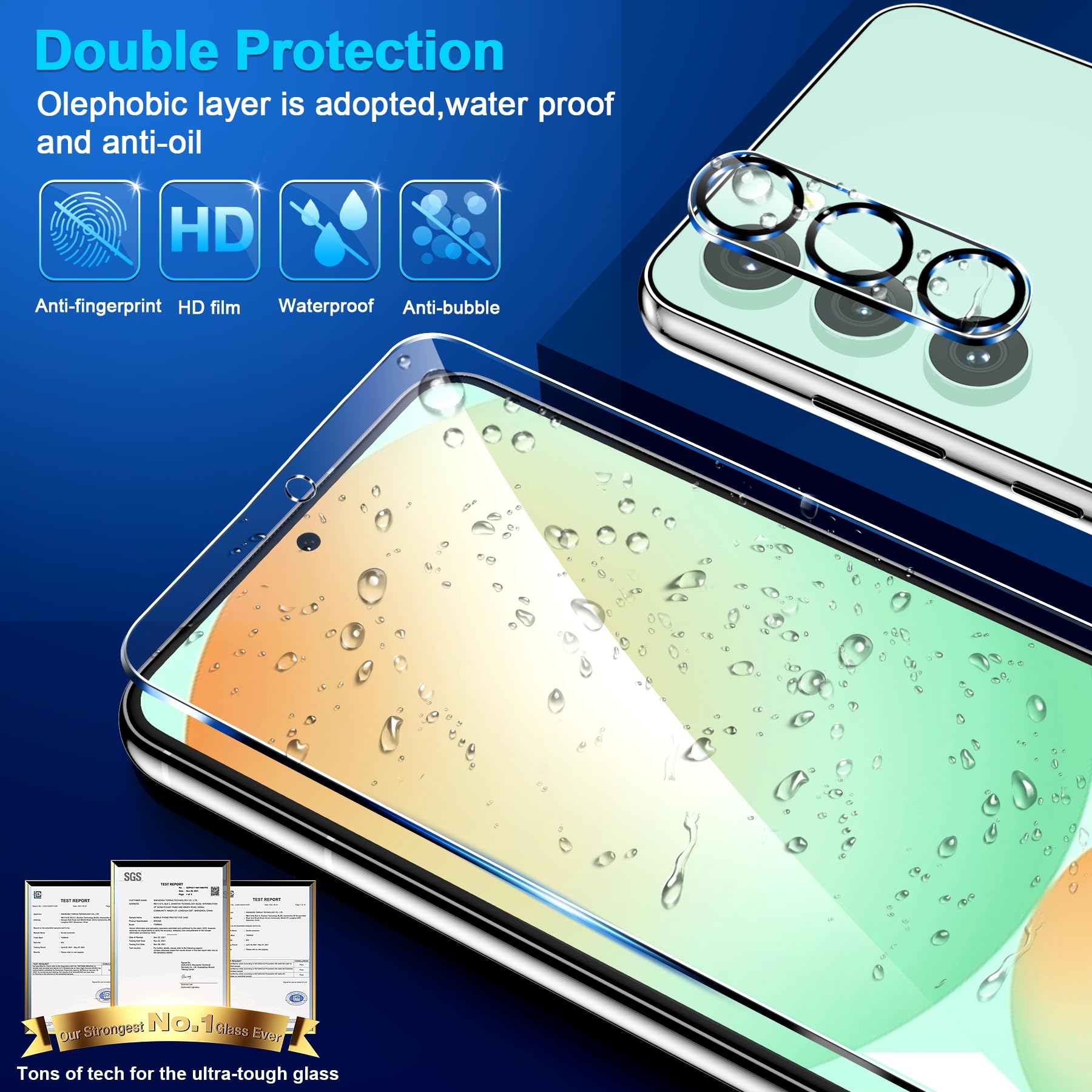 【6 Pack】3 Packs S24 FE Tempered Glass Screen Protectors with 3 Pack glass Camera Lens Protectors -- Only for S24 FE 6.7Inch , Not for S24 or S23 FE. ATTENTION: Activate the Touch Sensitivity, you must complete this step: 1: Open "Settings" 2: Navigate to "Advanced Features" 3: On the bottom, find and activate "Touch Sensitivity" and After pasting the tempered film, re-scan your fingerprint of the same finger twice at different angles to unlock more sensitively Product Feature: —Support Fingerprint Unlock, Compatible with Face Recognition. High touch sensitivity gives "True Touch" feel. —Does not fall off, Precise laser cut Full Glue Sticky tempered glass with 2.5D rounded edges technique —Case Friendly with most phone cases, Extra space is left around the borders for your case to wrap around the edges of your phone. —HD Clear 99.9% transparency crystal glass to remain the High-Definition image quality. night shooting function transparent lens film keeps your phone and phone photos' original color all the time. —9H hardness tempered glass that can powerfully resist wear & scratches, impact & drop; offering durable protection. —Anti-oil coating reduces collecting fingerprints,oil on the surface, allowing for crystal clear viewing. Package: 3 x Galaxy S24 FE Tempered Glass Screen Protector 6.7 inch 3 x Transparent Tempered Glass Camera Lens Protector 3 x Wet & Dry Wipes 3 x Dust-Absorber 1 x Instruction Manual