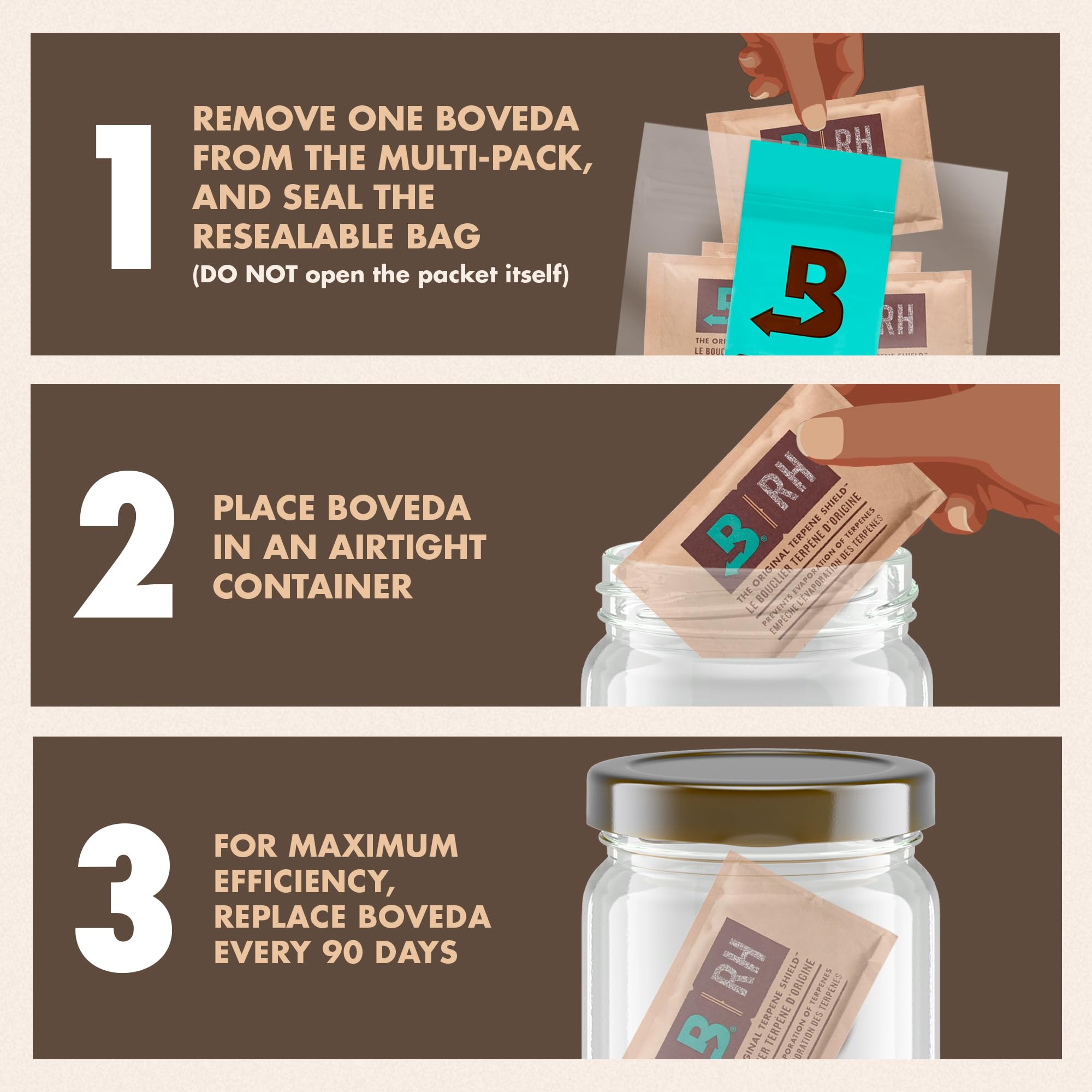 HOW TO USE: It takes seconds to keep your natural items fresh. Remove the moisture packs from the resealable bag, slip the Boveda 62 humidity pack into your airtight container, fill it with your items, & close it. BOVEDA DOES THE REST. DO NOT cut or open the brown humidity packet. Replace every 3 months. You'll know it's time to swap out Boveda when it becomes hard and crunchy. NEVER MIX the 62% with any other %RH.