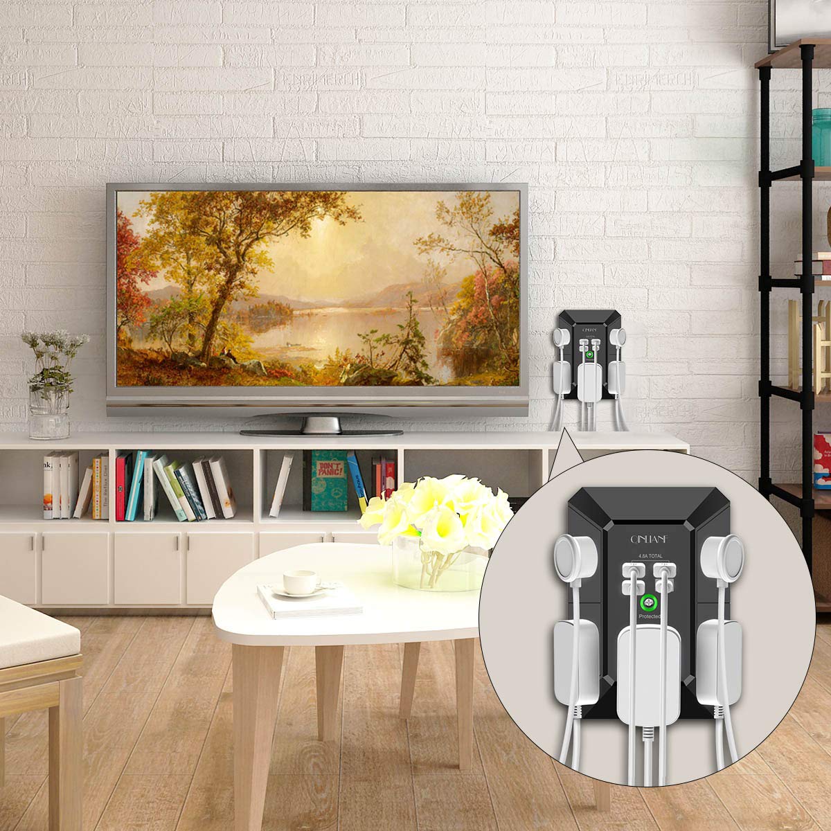 【 Multi Function USB Outlet】- Securing onto the wall design. Fit duplex outlet perfectly, just plug in to use. You get 5 AC outlet splitter (3 sides) with wide space in between; 4 USB charger ports; using the screw at the middle to secure it onto the wall for duplex outlet, so it is not pulled out when pulling the plugged in devices and loss power. Note: this works on duplex outlet only, other types of outlet like GFCI outlet cannot be secured onto the wall.
