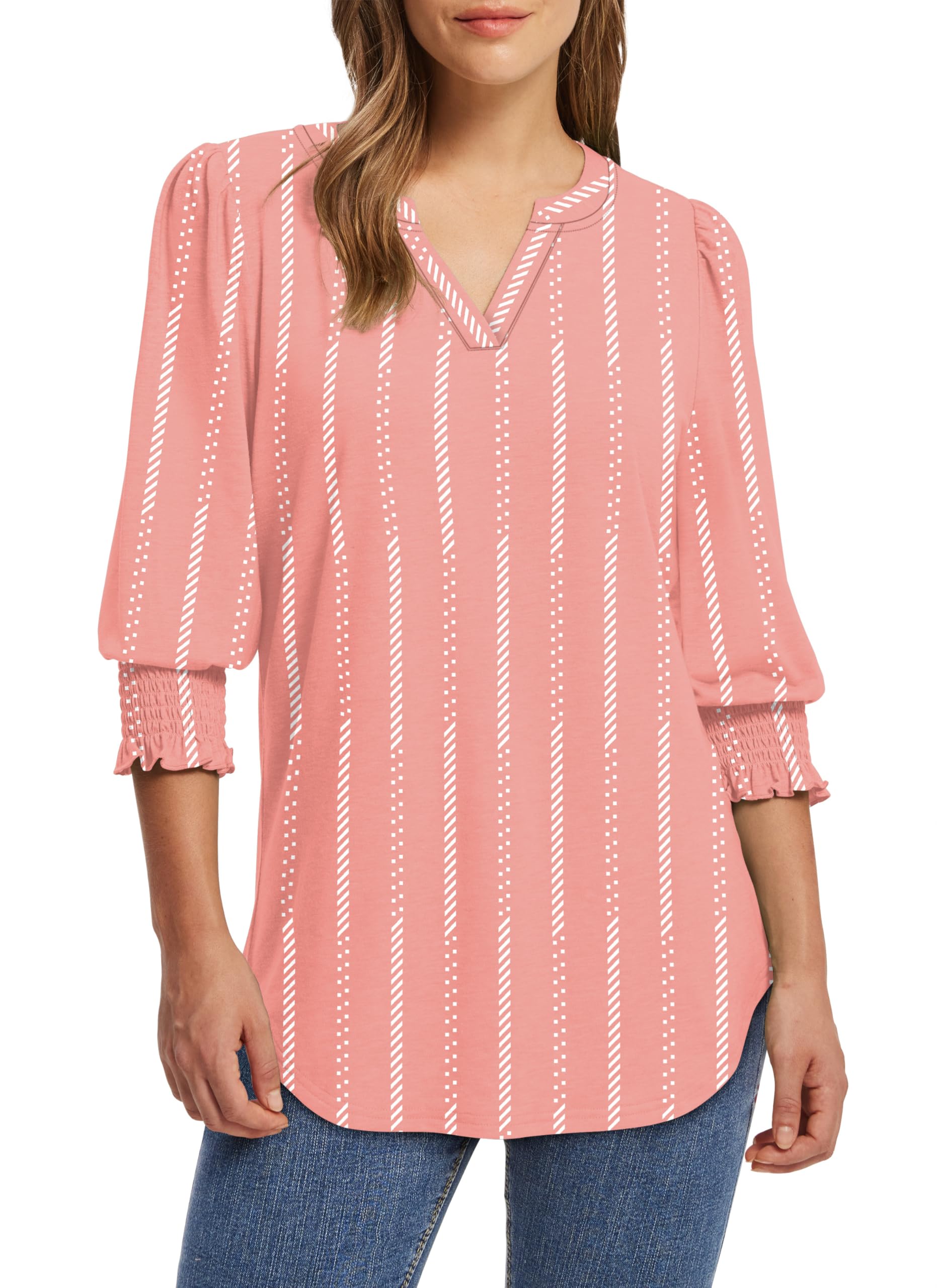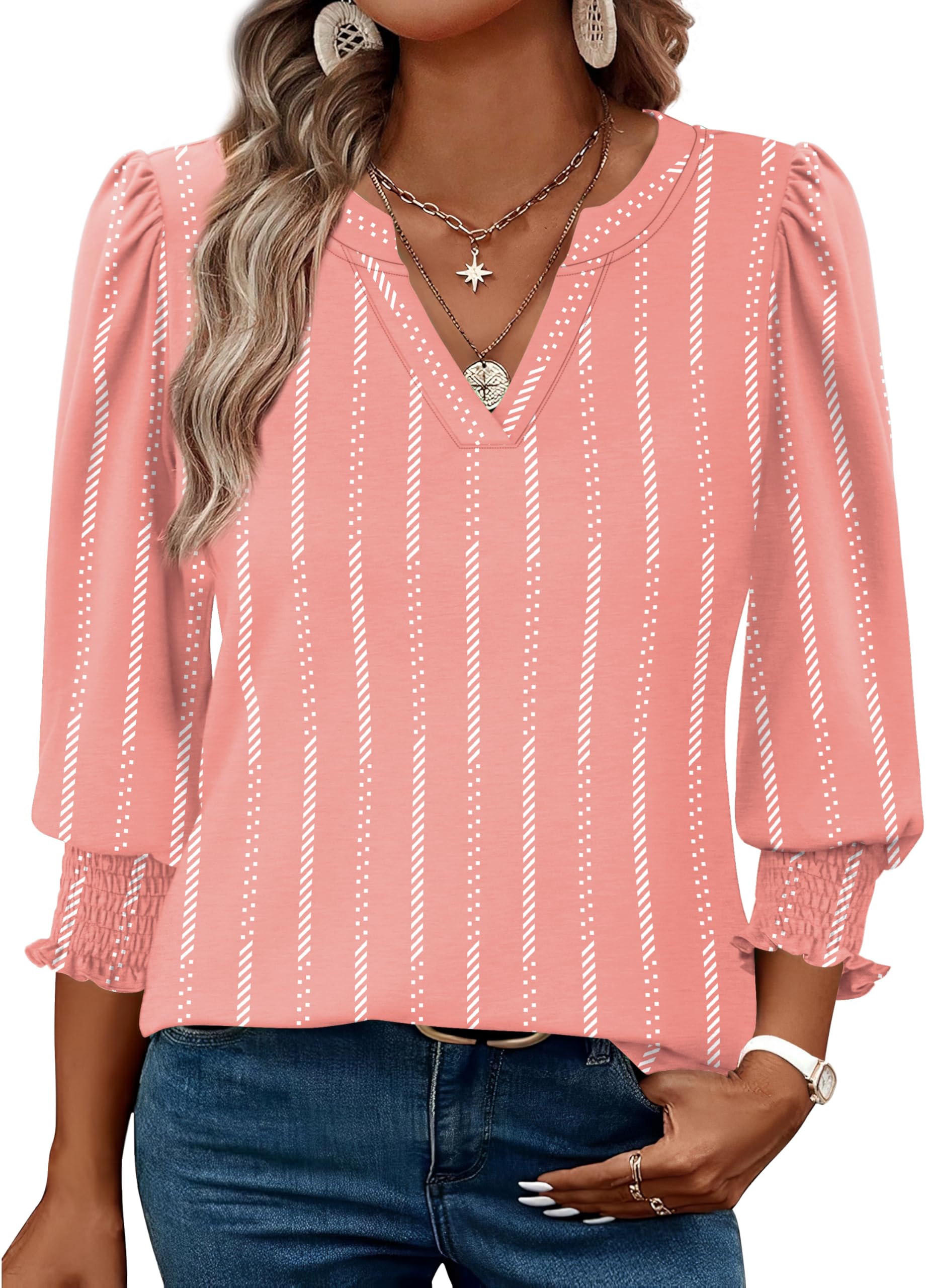 ♥Feature: Cute 3/4 sleeve length womens tops. The exquisite small V-neck can perfectly show your clavicle line sexy and elegant.The puff sleeves with smocked cuffs are attractive and comfy for business casual wear.