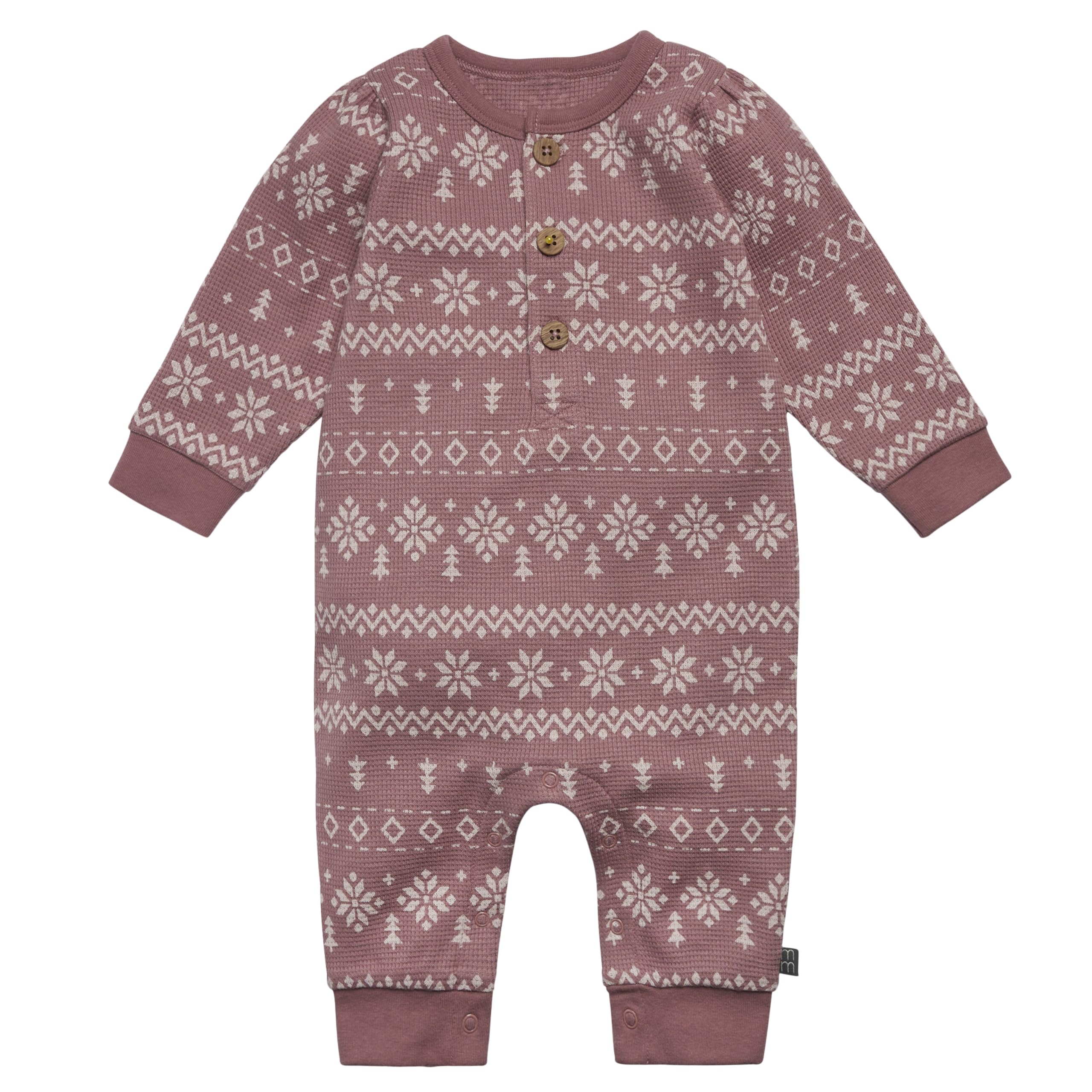 Description Keep your little explorer cozy and stylish with our baby romper, crafted from soft and stretchy waffle knit fabric for all-day wear. Designed for cooler weather, this romper features comfort-stretch ribbing at the neckline, wrists, and ankles, ensuring a snug fit that moves with your active little one. The fashionable faux wood functional buttons add a trendy touch to this adorable piece, and with simple machine cleaning, it will be a favorite all season long.