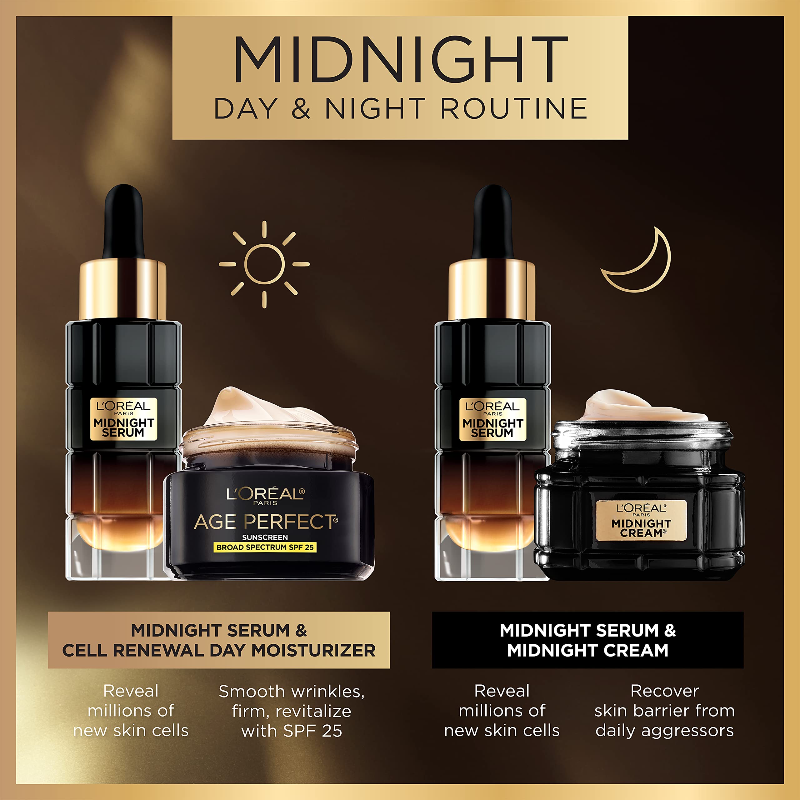 Give your skin a new beginning! Reveal Millions Of New Surface Cells, Visibly Younger Skin: Age Perfect Cell Renewal Midnight Serum sets a new standard for luxury serums. In fact, Women Prefer It Over The #1 Luxury Night Serum*. Formulated with an exclusive Antioxidant Recovery Complex, this powerhouse anti-aging serum works at night when skin reaches its peak of cell renewal. Millions of new cells are revealed for visibly smoother, more radiant and younger skin. Effective For All Skin Types & Tones, it is made without parabens or mineral oil, and is allergy tested - suitable for even sensitive skin. What Is An Antioxidant Recovery Complex? Our exclusive Antioxidant Recovery Complex helps boost skin's renewal overnight by combining a powerful, L'Oreal patented antioxidant—derived from bitter orange—and Vitamin E to help reinforce skin's barrier. This breakthrough serum replenishes skin’s antioxidant levels at night when it is most receptive to repair. Our formula also contains Hyaluronic Acid—a powerful hydrating ingredient that helps lock in moisture. Smooth Wrinkles, Firmer, More Radiant Skin: After 1 use, skin feels refreshed, softer, and smoother. In 1 week, skin appears brighter, more luminous and younger. Over time, wrinkles are smoothed, skin looks firmer and more radiant. Indulgent, Luxurious Formula: Each drop of this lightweight serum provides intense hydration while leaving skin luxuriously soft to the touch. It absorbs quickly with a non-greasy, non-sticky finish and won't clog pores. Custom Designed, Glass Bottle: With its sleek, modern design and gold finishes, this serum bottle was meticulously crafted to become an icon! Its beautifully etched glass provides an elevated look and uses recycled and recyclable glass material.