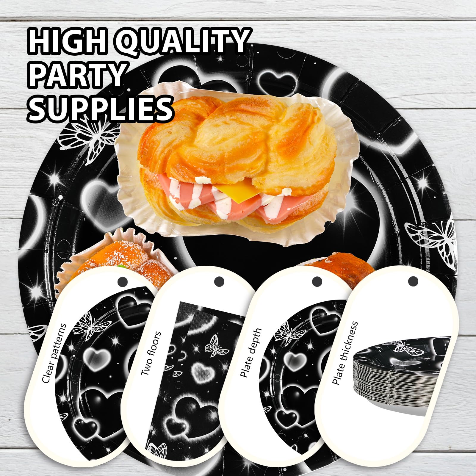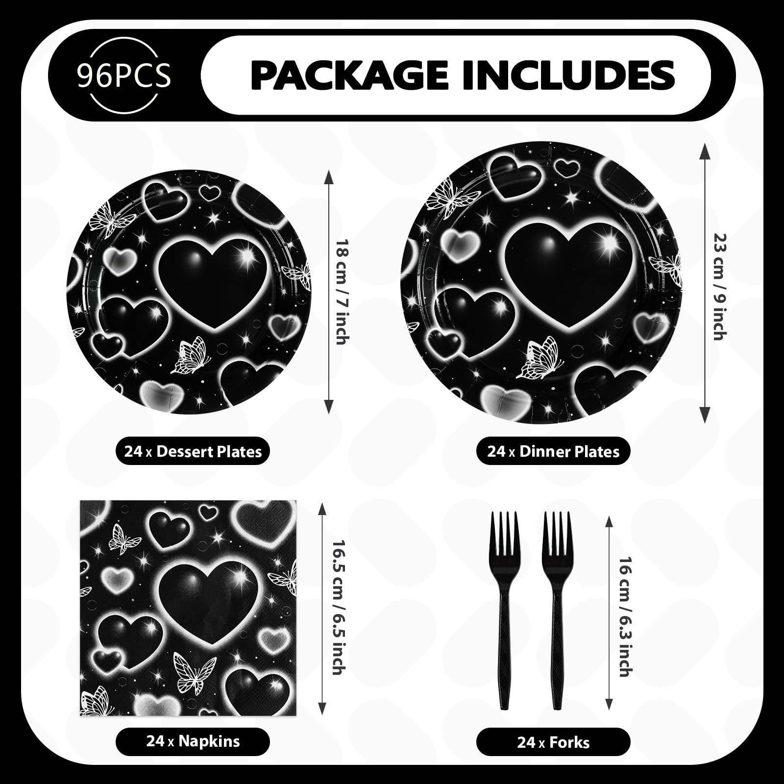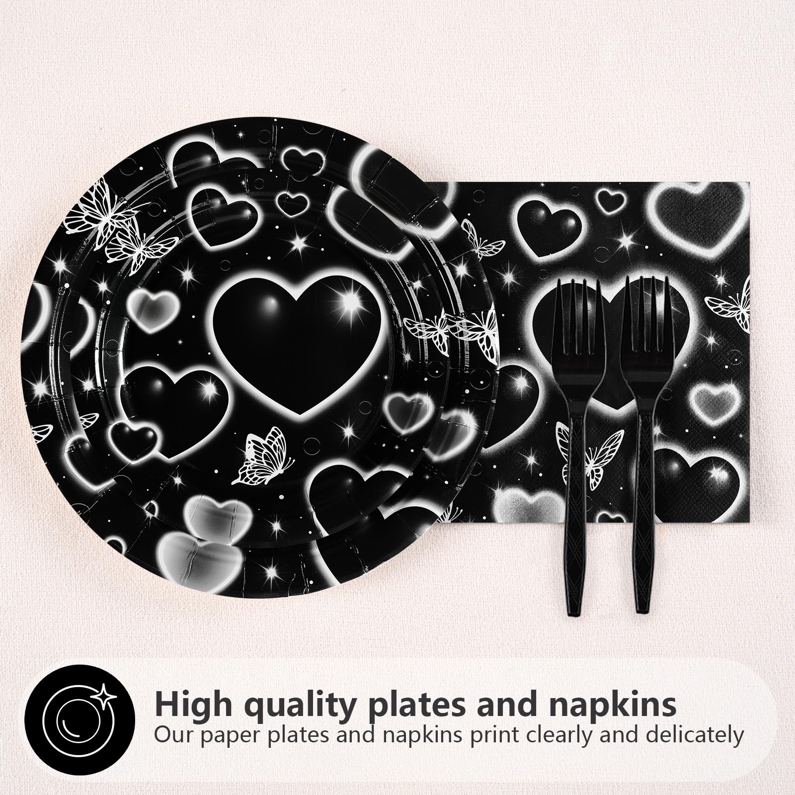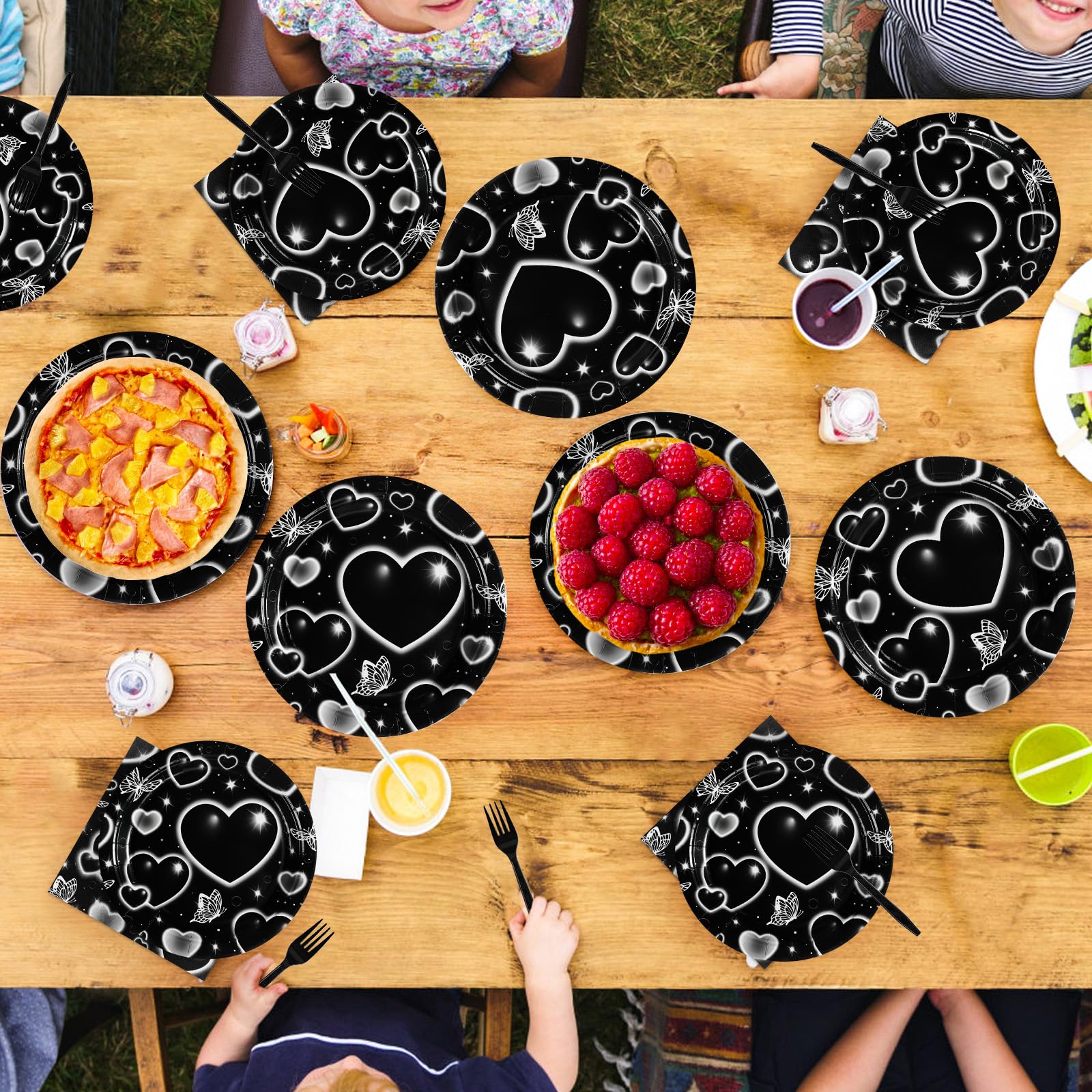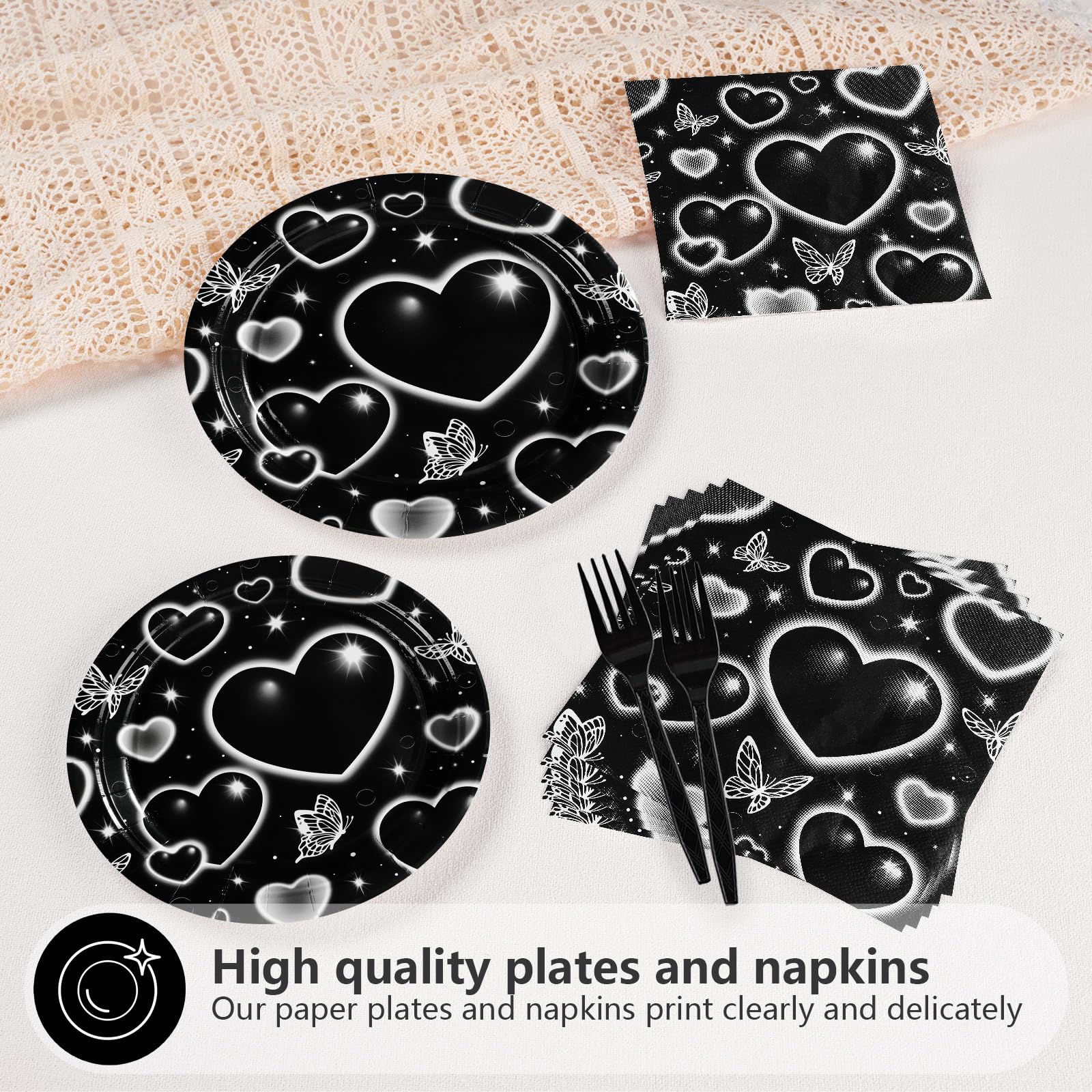 Grencian 96 Pcs 2000s Party Plates and Napkins Black Heart Tableware Supplies Y2k Theme Birthday Party Decoration Early 2000s Dinnerware Decorations for Birthday Wedding Bridal Shower Serves 24