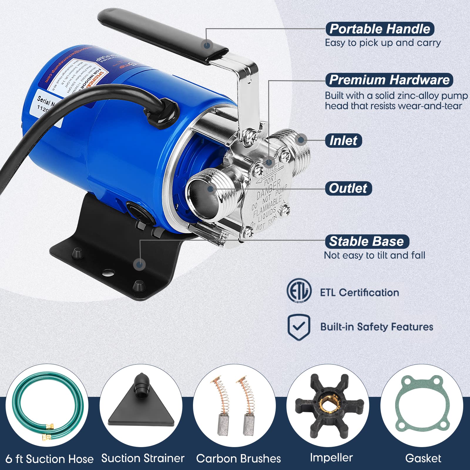 【115V Water Pump】Volts/Frequency:115V/60 HZ; Power:1/10 HP; Max.Flow Rate:330 GPH; Discharge:3/4 in.GHT; Max.Suction Lift:6 ft; Max.Discharge Head:40 ft; Discharge Port:3/4 Inch; Suction Port:3/4 Inch.