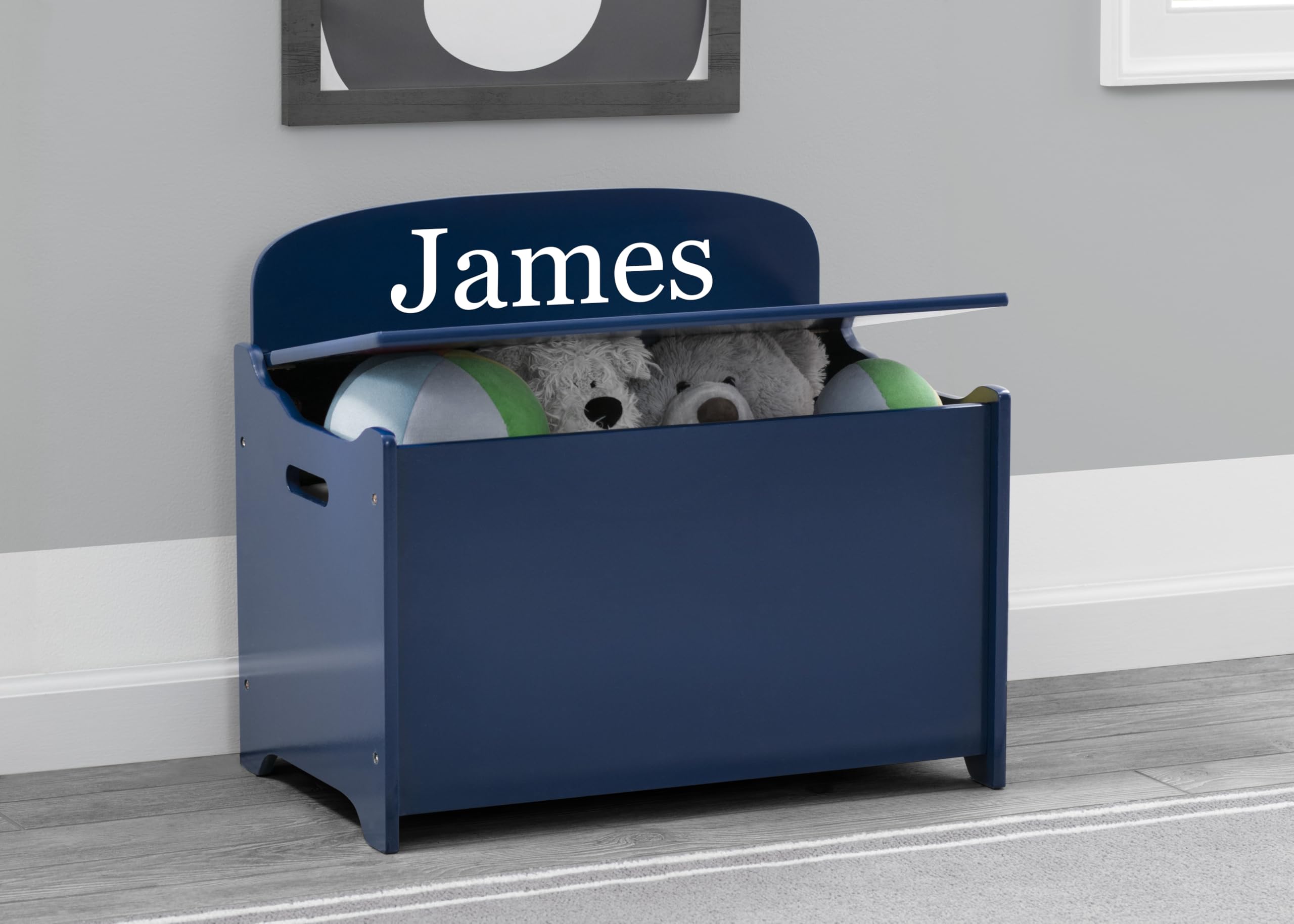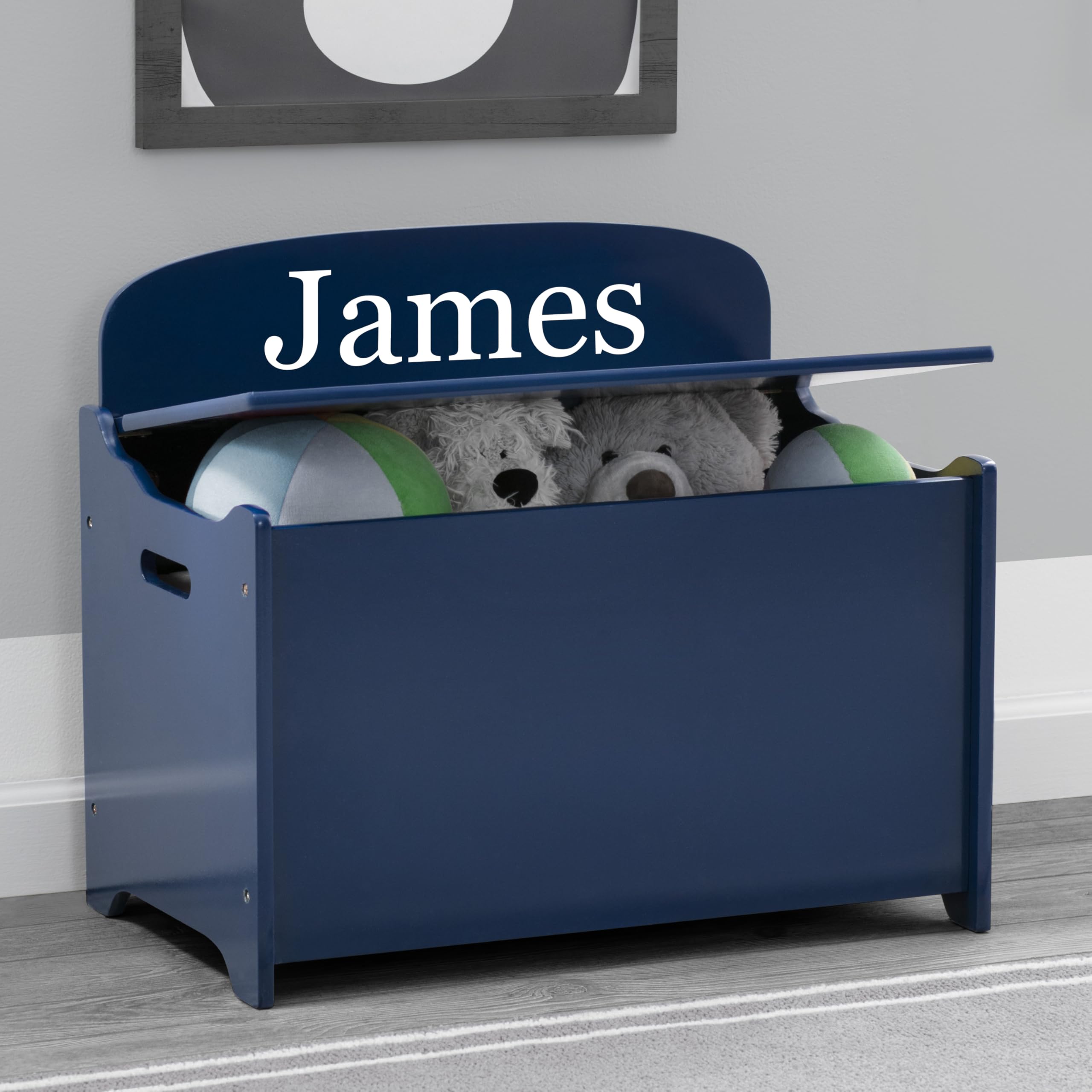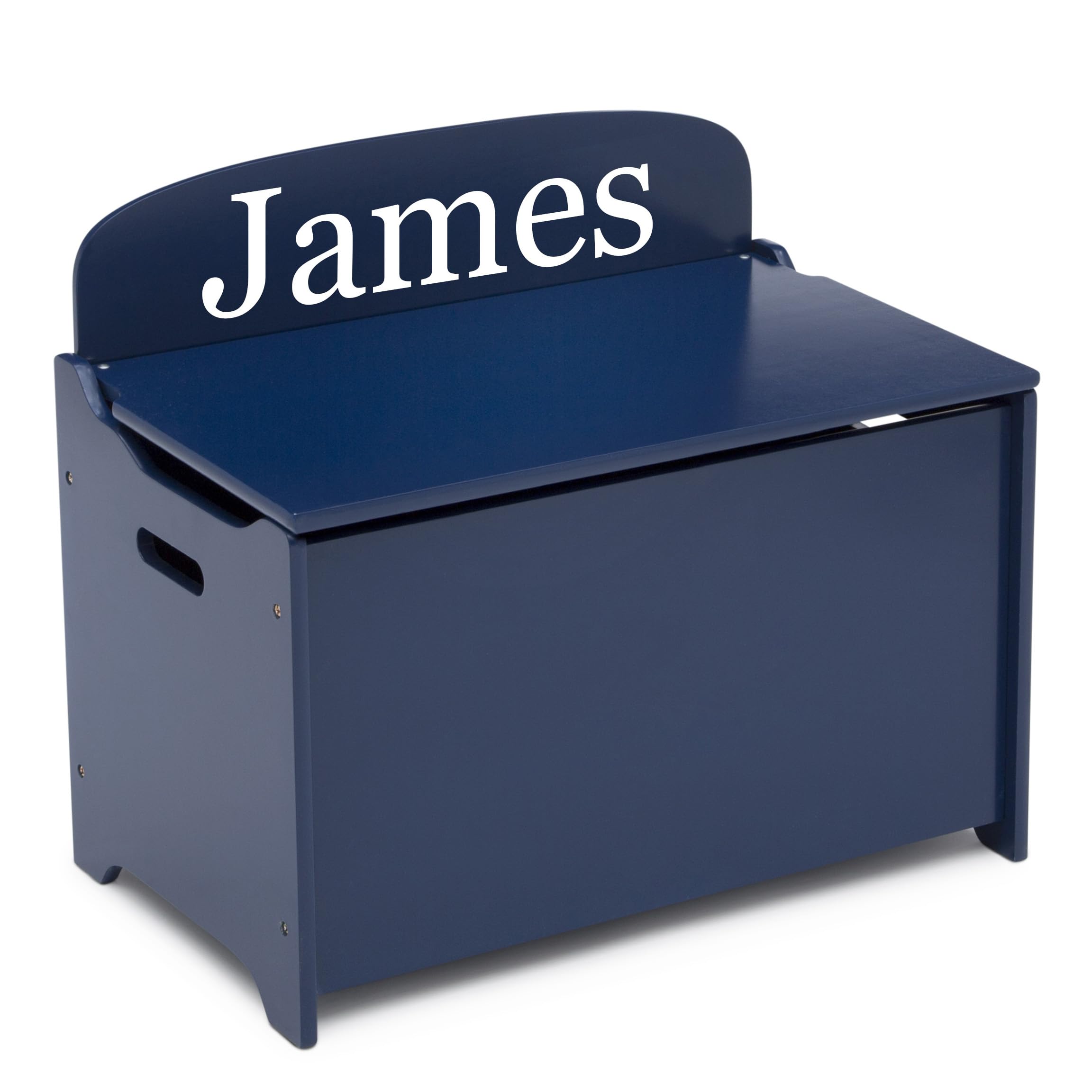 The Personalized MySize Deluxe Toy Box by Delta Children is a stylish storage option for the living room, playroom or your child's bedroom. Outfitted with a spacious interior, this toy organizer provides plenty of space to store toys large and small. Cutout handles on either side allow you to easily move the toy box from room to room. Designed with a slow-closing lid to prevent little hands from getting caught, the Delta Children MySize Deluxe Toy Box is a safe choice for your little one. Add your childβs name for an extra-special touch. Personalization is available in variety of font choices and font colors for a more customizable design. Just choose font, color and name, and we will personalize your toy box up to 15 letters max. Toy box available in several beautiful colors. Coordinates with other items in the Delta Children MySize Collection. MYSIZE Trademark Used With Permission. Delta Children was founded around the idea of making safe, high-quality children's furniture affordable for all families. They know there's nothing more important than safety when it comes to your child's space. That's why all Delta Children products are built with long-lasting materials to ensure they stand up to years of jumping and playing. Plus, they are rigorously tested to meet or exceed all industry safety standards.