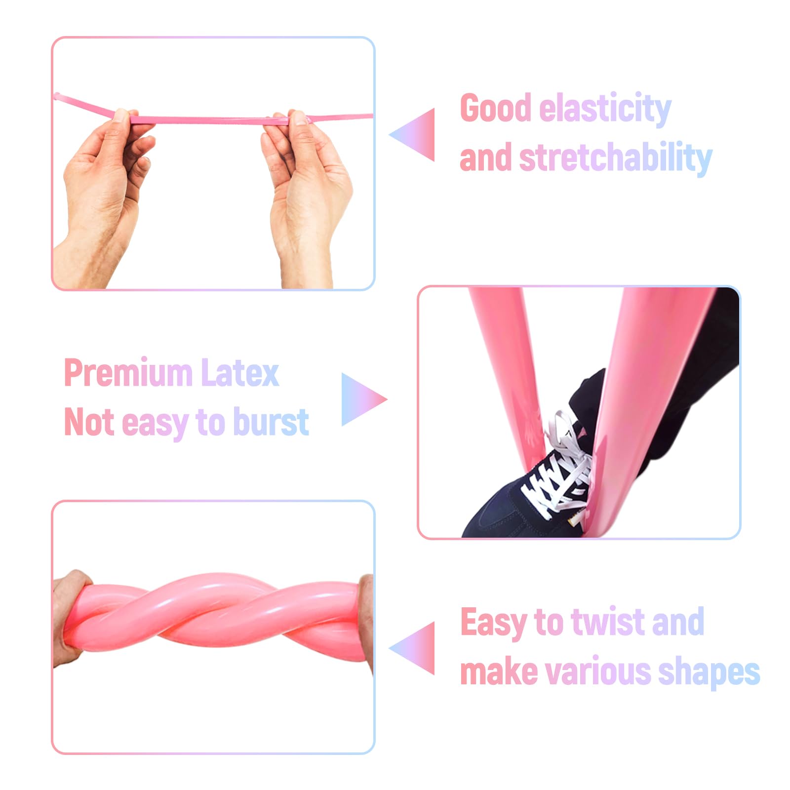 Materials: fresh pastal 260 balloons selected high-quality latex, environmental protection, full elasticity, easy to meet a variety of creative modeling needs, safe and durable, rest assured to enjoy the fun of creation.