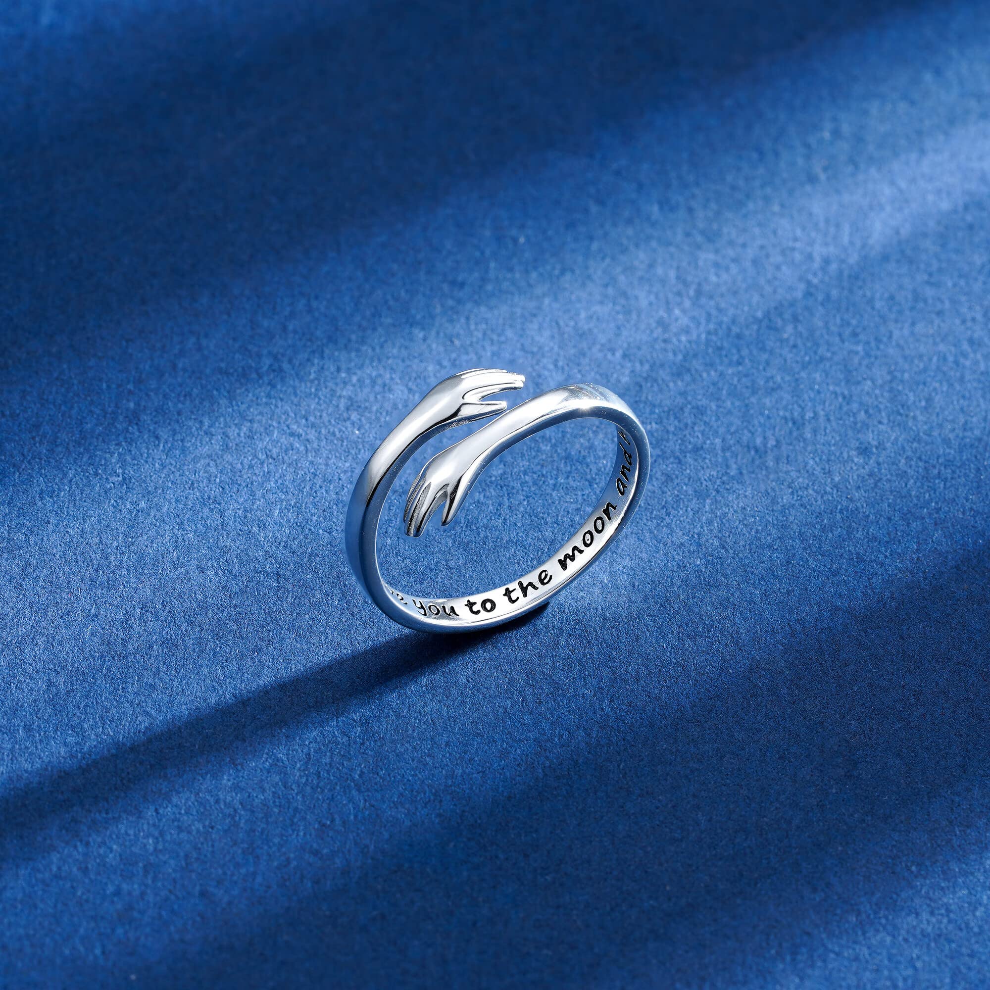 A hug is a symbol of comfort, encouragement, love, and protection. Engraved βI love you to the moon and backβon arms to endow a unique meaning to this hug ring.It means wherever you are I will be always with you like this hug ring hugging you forever.
