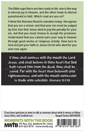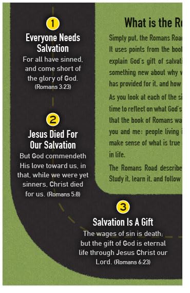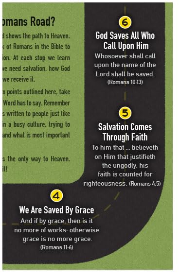 SUMMARY: Takes the reader on a walk down the "Romans Road" of salvation verses. FEATURES: This 4-page leaflet measures 3.5 x 5.5 inches. Shrink-wrapped in packets of 100. Verse quotations from the NKJV. Colorful images and high-quality, glossy paper increase appeal. Written, designed, and printed in the USA. Use these evangelistic handouts to share the good news of Jesus everywhere you go! FROM THE FULL MESSAGE: What is the Romans Road? Simply put, the Romans Road shows the path to Heaven. It uses points from the book of Romans in the Bible to explain God’s gift of salvation. At each stop we learn something new about why we need salvation, how God has provided for it, and how we receive it. As you look at each of the six points outlined here, take time to reflect on what God’s Word has to say. Remember that the book of Romans was written to people just like you and me: people living in a busy culture, trying to make sense of what is true and what is most important in life. The Romans Road describes the only way to Heaven. Study it, learn it, and follow it! 1. Everyone Needs Salvation For all have sinned and fall short of the glory of God. (Romans 3:23) 2. Jesus Died For Our Salvation But God demonstrates His own love toward us, in that while we were still sinners, Christ died for us. (Romans 5:8) 3. Salvation Is A Gift The wages of sin is death, but the gift of God is eternal life in Christ Jesus our Lord. (Romans 6:23) 4. We Are Saved By Grace And if by grace, then it is no longer of works; otherwise grace is no longer grace. (Romans 11:6) 5. Salvation Comes Through Faith To him who … believes on Him who justifies the ungodly, his faith is accounted ...