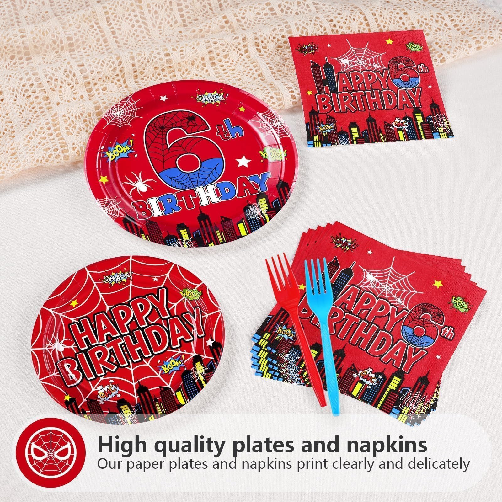 SPIDER 6TH BIRTHDAY PARTY SUPPLIES: Get everything you need in wonderful kit! Our 96 piece all-inclusive spider birthday party sets Include 24 9" dinner plates, 24 7" dessert plates, 24 spider theme napkins & 24 forks. With enough pieces to serve 24 guests, you’ll have everything needed to celebrate your child’s 6th birthday
