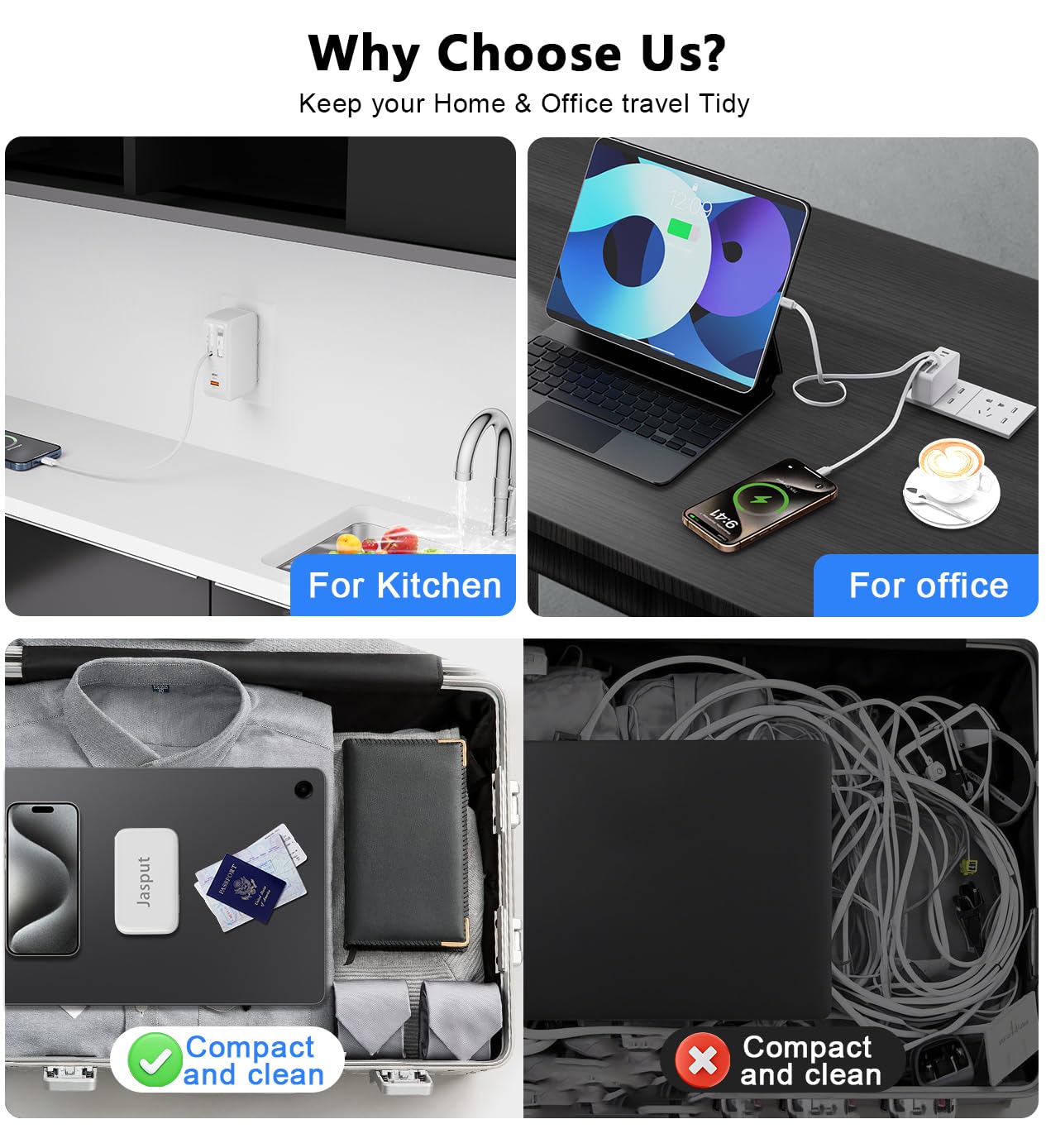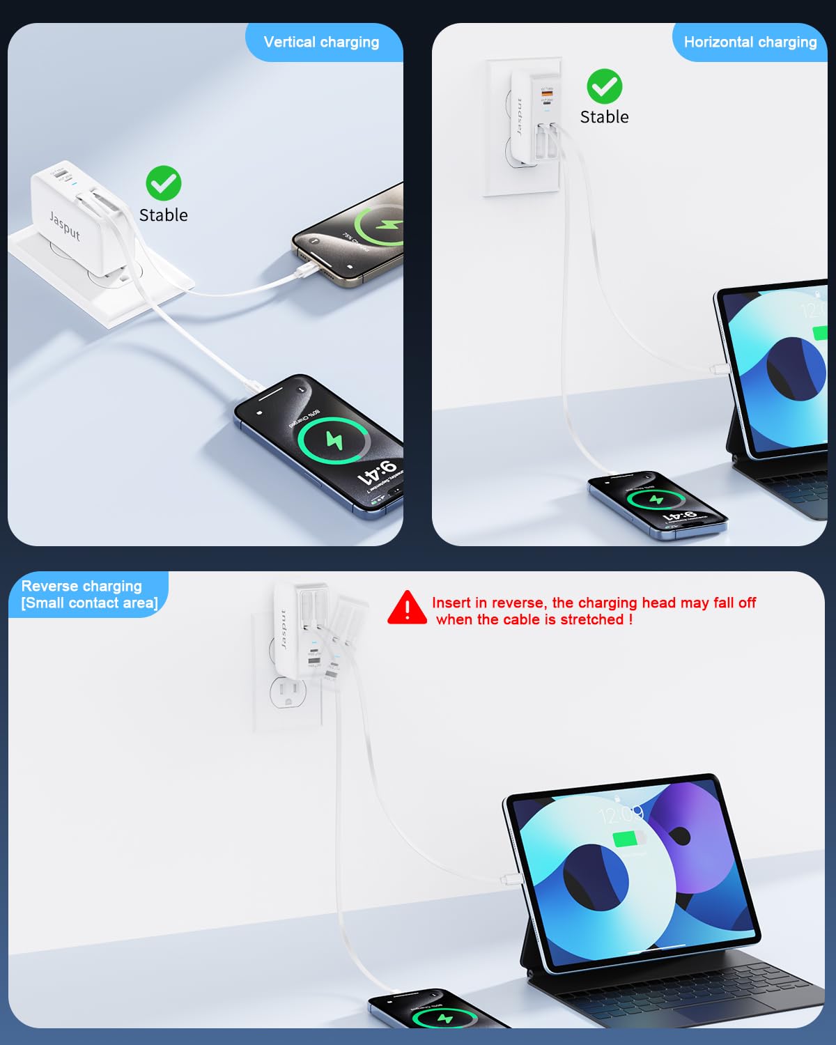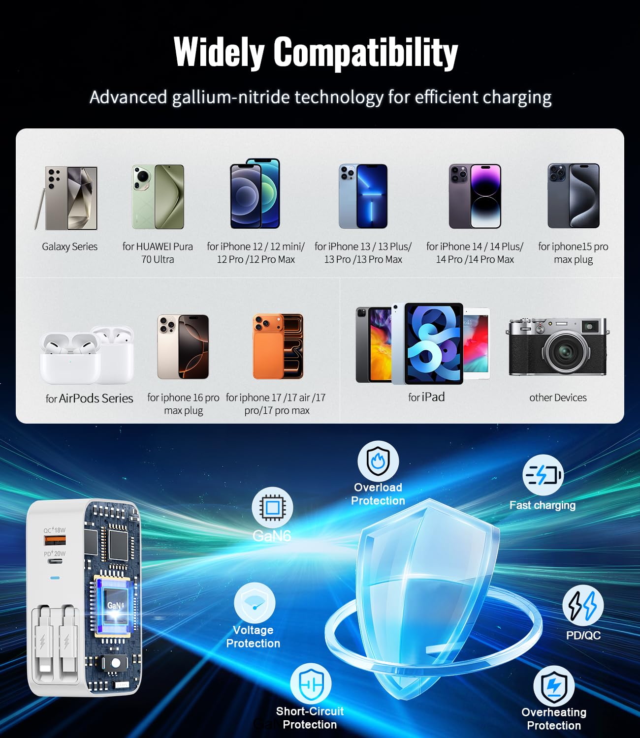 【Revolutionary GaN6 Technology】Slow charging ? overheating? The retractable charger usb c adopt high quality chips and advanced GaN6 technology materials. It generates less heat,charges faster and more stable than traditional charger block. Built-in overcharge, overcurrent, overvoltage, short circuit and other protection to protect your equipment.