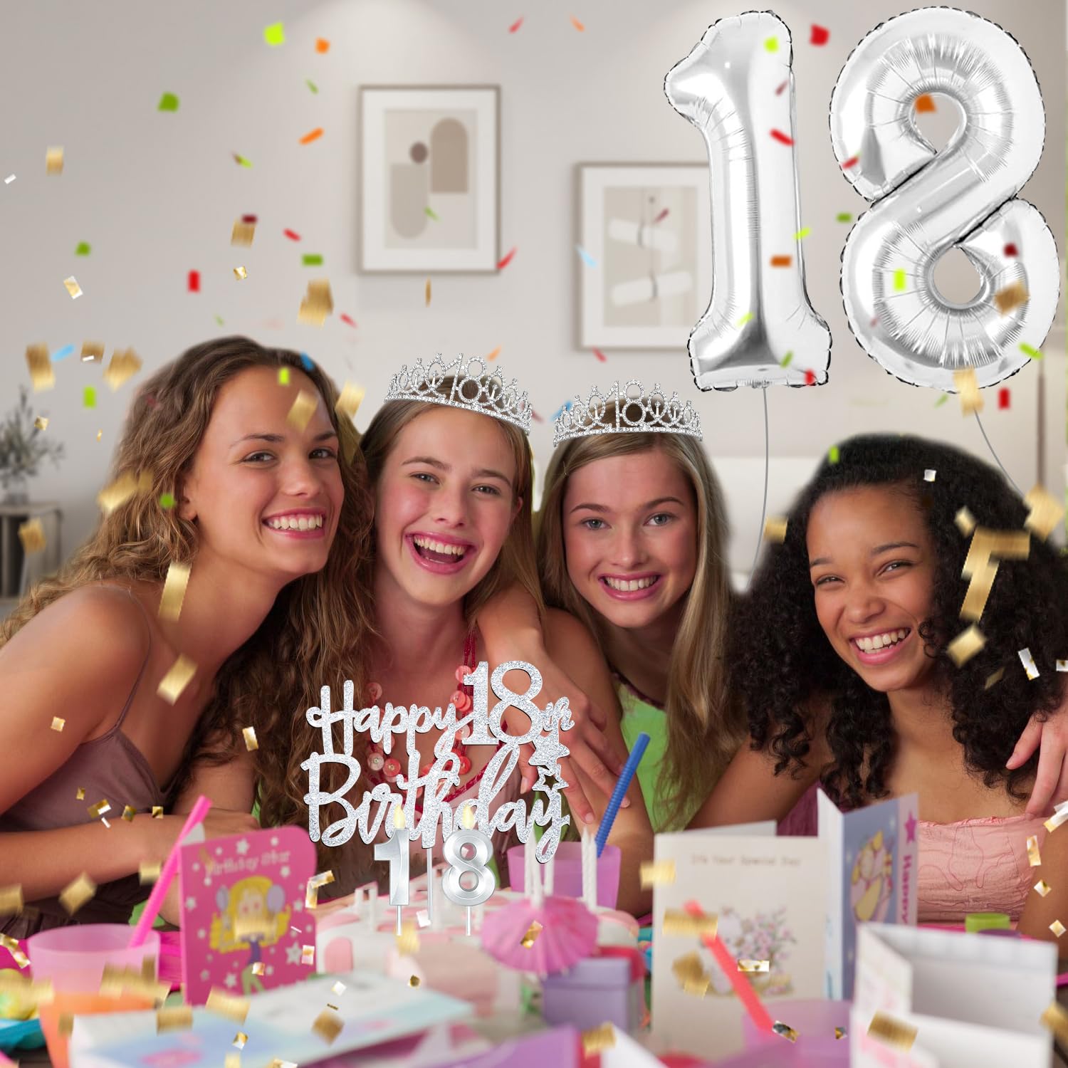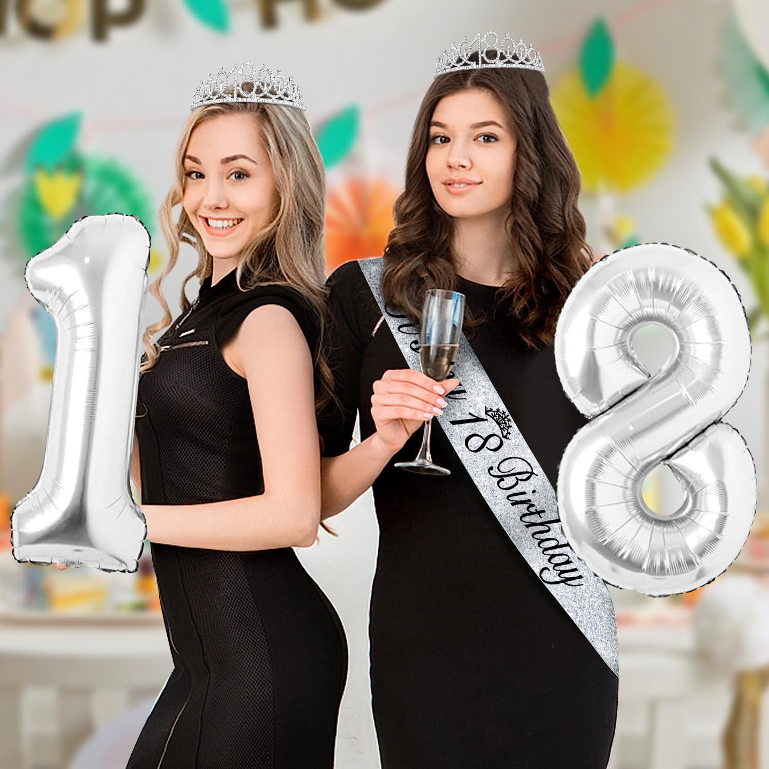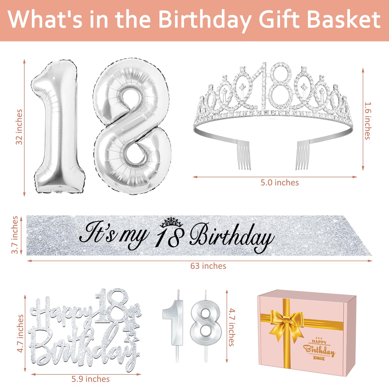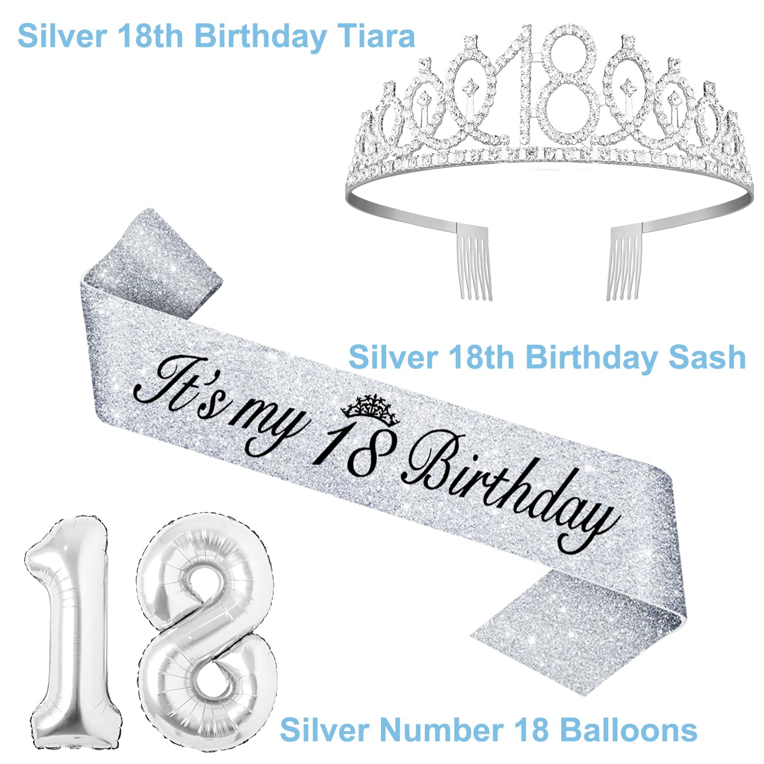 18th Birthday Gifts for Girls: Silver 18 Tiara/Crown x1pc, Sliver “It’s my 18 Birthday” Sash x1pc, Silver Happy 18th Birthday Cake Topper x1pc, Silver Numeral 18 Balloons x1set, Silver Number 18 Candles x1pc, Birthday Card x 1pc. All of these birthday accessories are packed in a pretty gift box for good presentation. It's a great 18th birthday gifts for girls