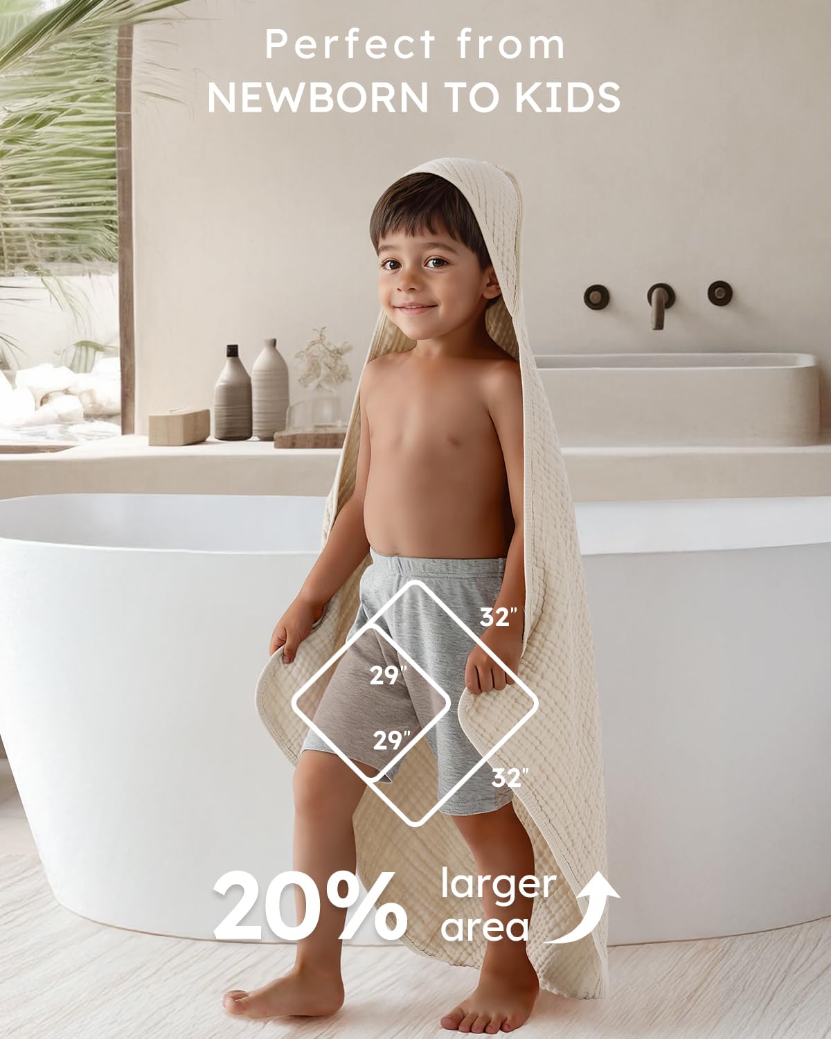 [Excellent Durability] - The 6 layers thickness muslin design is long-lasting enough for everyday use. Sized in 32 x 32 inches, the hooded baby towels are suitable for newborns, infants, toddlers, and small kids up to 3 years old.