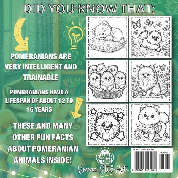Title: Pomeranian Coloring Book - Pomeranian Playtime Coloring Book for Kids 🐾Embark on a Colorful Journey with Playful Pomeranians!🐾 Exciting Pomeranian Scenes: Our Pomeranian coloring book is filled with pages of adorable and playful Pomeranians, perfect for sparking your child's creativity. Each illustration is kid-friendly, showcasing these fluffy dogs in a variety of fun settings. What you will find in this book: 50 Beautiful and Funny Coloring Pages Bold, thick lines Single-sided print to prevent bleed through Large Format – 8.5 x 8.5 inches Learn with 50 Fun Facts: Color and learn! This book includes 50 amazing facts about Pomeranians, making coloring an educational adventure. Your child will discover interesting insights about their favorite breed while enjoying artistic play. Designed for Young Artists: Tailored for children, our coloring book offers simple yet engaging designs. It's a wonderful way for kids to practice their coloring skills, enhance their focus, and express their creativity. Safe and Enjoyable: Printed on high-quality, our book is perfect for crayons, colored pencils, and washable markers. durable and easy to color, ensuring a lasting and enjoyable coloring experience. The Perfect Gift for Little Pomeranian Fans: If your child loves dogs, especially Pomeranians, this coloring book makes an ideal gift. It's great for birthdays, holidays, or just as a fun surprise to encourage artistic growth. Join the fun and explore the delightful world of Pomeranians with every color of the rainbow - a perfect adventure for every young artist!