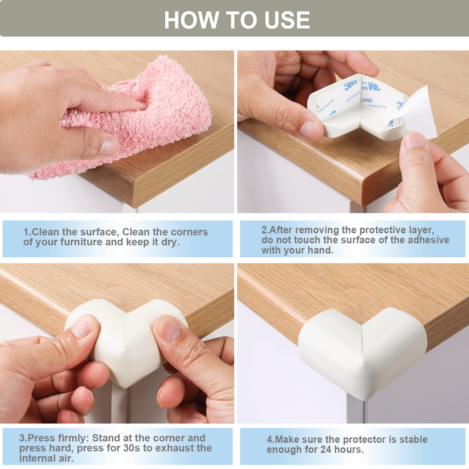 Easy to Install : corners are soft sponge ,the color matches most of furniture , Safety Corner Guards come pre-taped using double sided adhesive , All you need to do peel off the tape and stick it to the corner that you need to protect. and press for one minute. Clean the surface before installation to ensure that there are no dust, water, oil, and do not move the corner protector within 24 hours of installation. Edge Protectors suit for Sharp Corners of Cabinets, Tables, Drawers