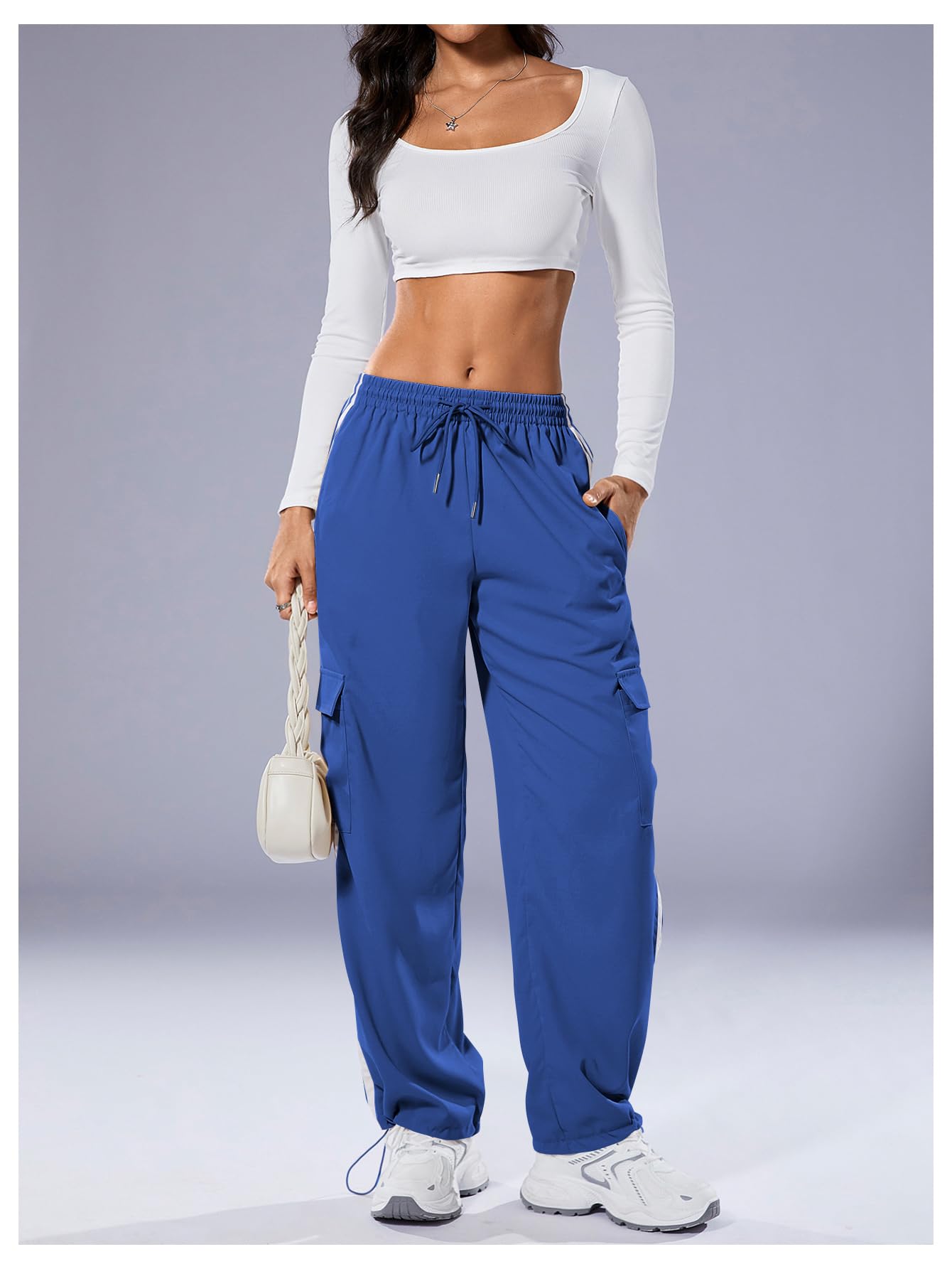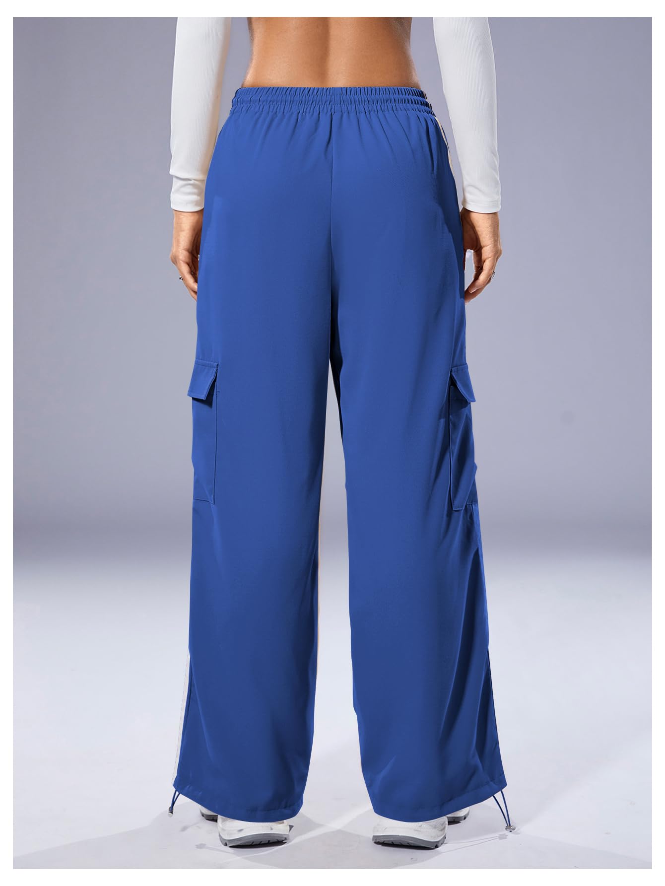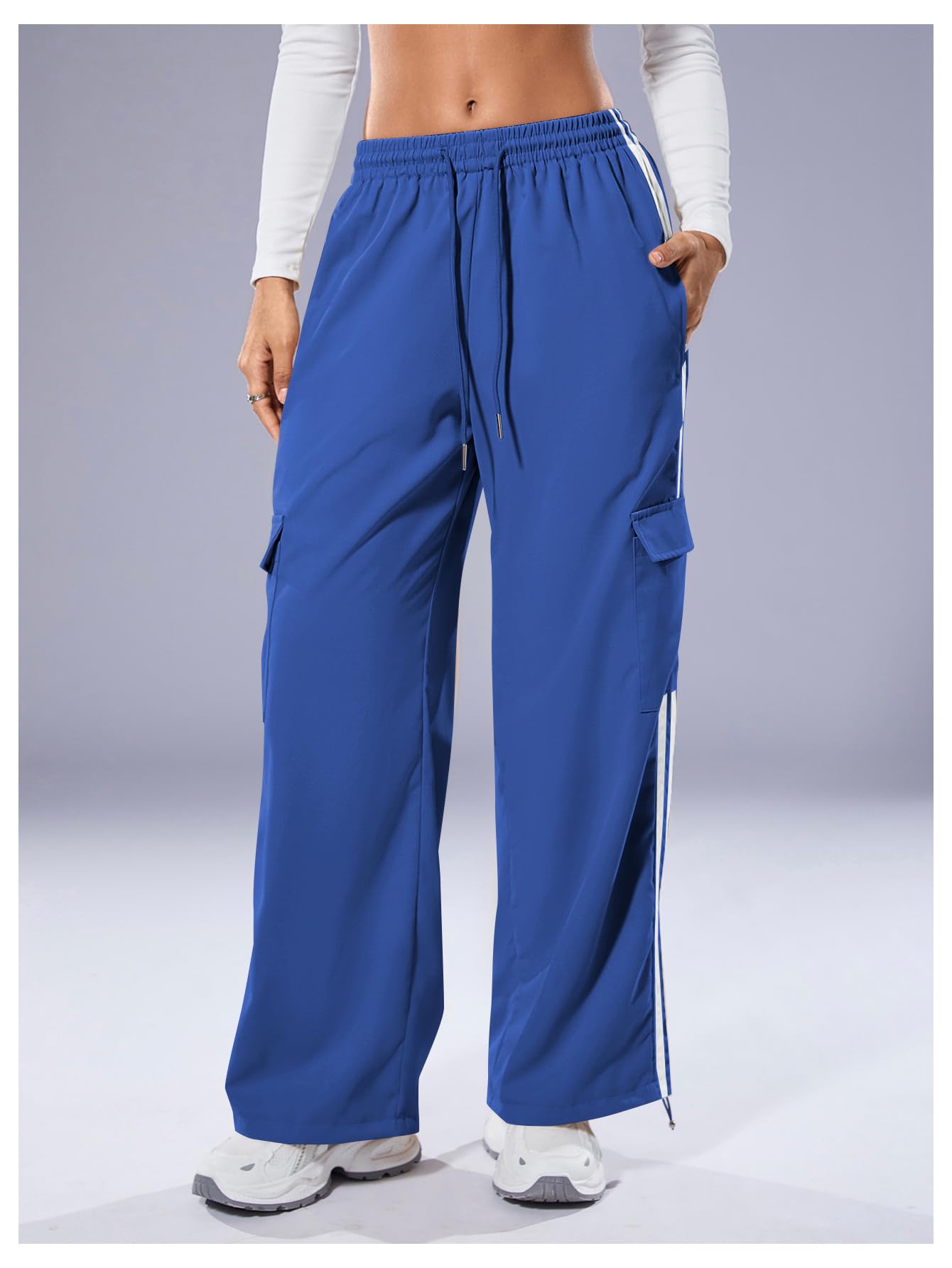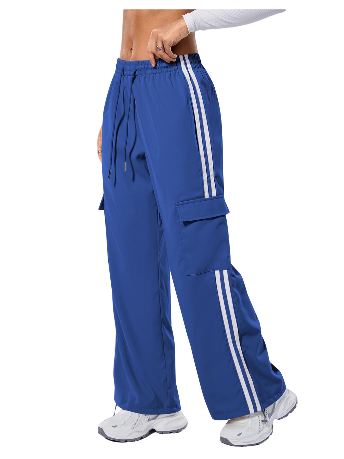 Drawstring Front and Hem, Elastic High Waist, Cargo Pocket Side, Straight Leg, Patched Stripes, Casual Long Pants