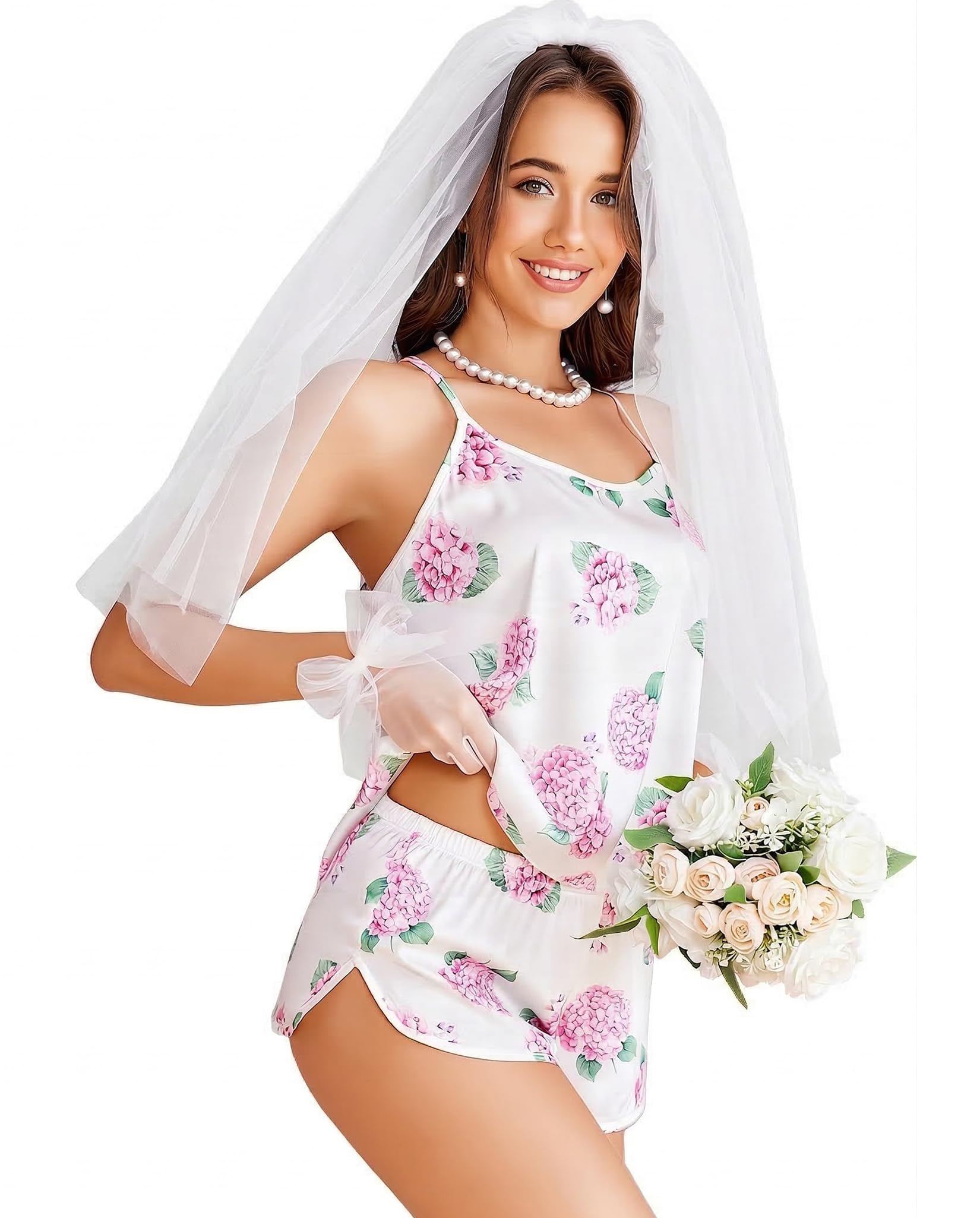 2-PIECE CAMI & SHORTS: Playful & Eye-Catching Prints, flirty sexy satin pajamas for women—playful gothic/cute prints & solid hues; adjustable cross-back cami & side-slit shorts. Ideal for gothic gatherings/sleepovers/Halloween/bachelorette parties