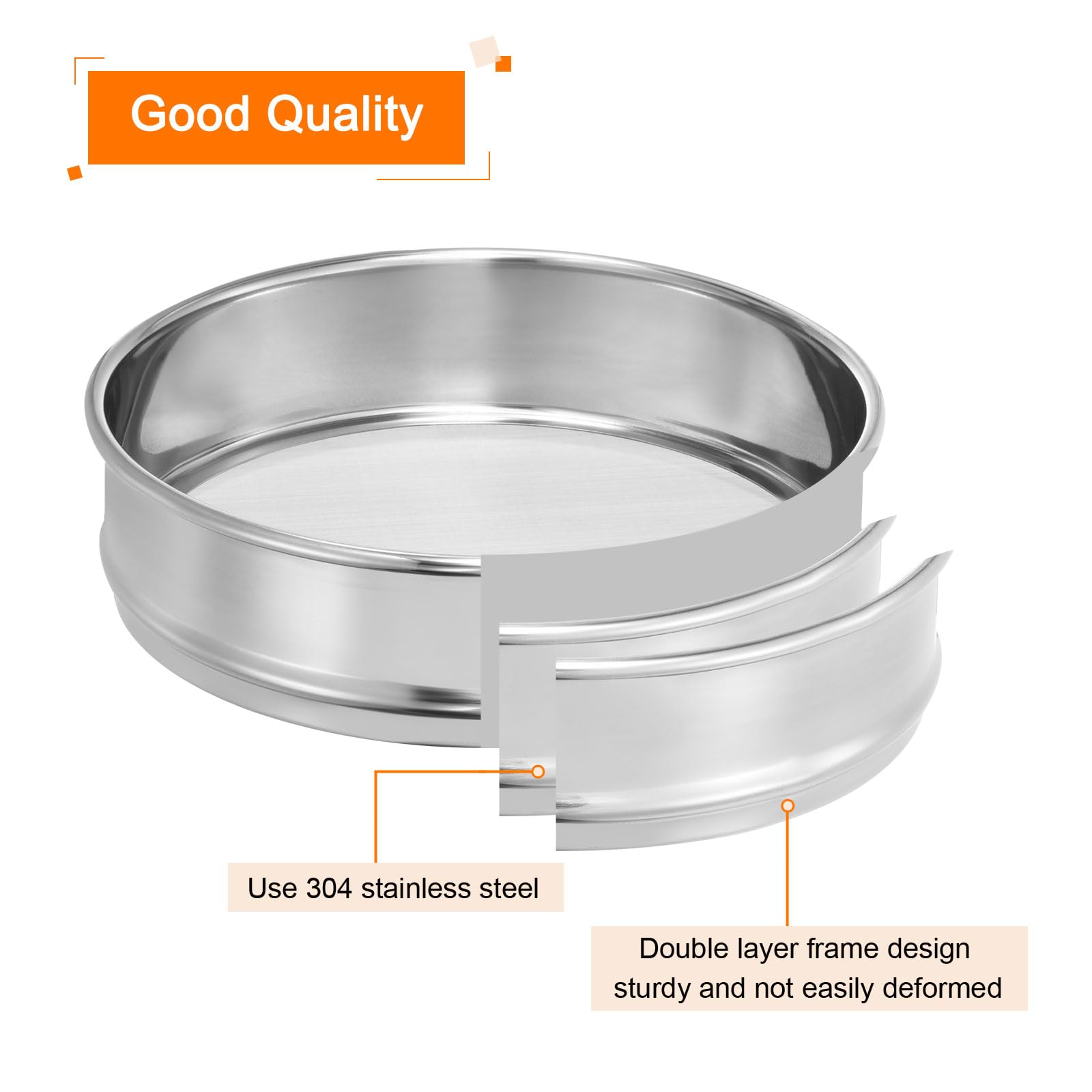 Good Quality: Use double layer frame design, all use 304 stainless steel, strong and sturdy and not easily deformed can bear weight up to 220 pounds, the screen mesh is made of standard 304 stainless steel, with precise aperture, flat and not easy to fall off