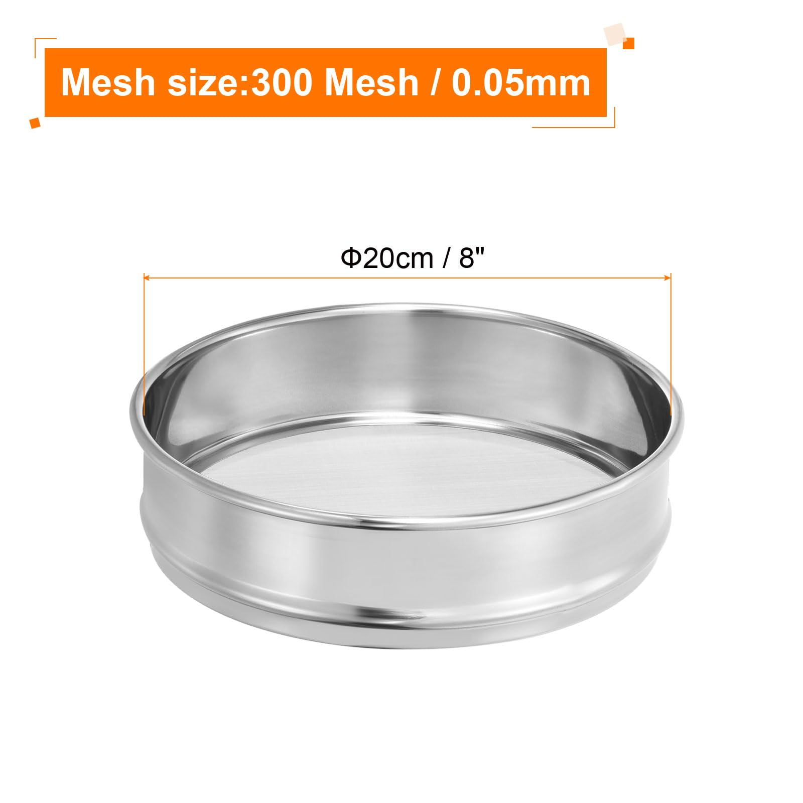 Lab Test Sieve: The size for this lab sieve is 300 Mesh / 0.05mm mesh, 20cm / 8" diameter, 5.5cm / 2.17" height