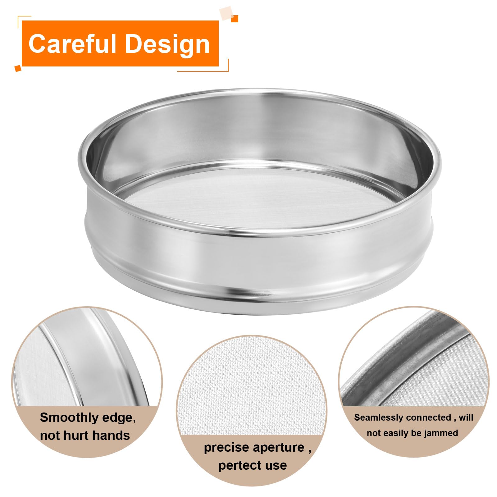 Careful Design: The test sieve bottom edge pressing is smooth, the screen is not exposed will not sticky, the screen frame and screen are seamlessly connected so will not easily jammed and is easy to clean, can be used repeatedly, more efficient
