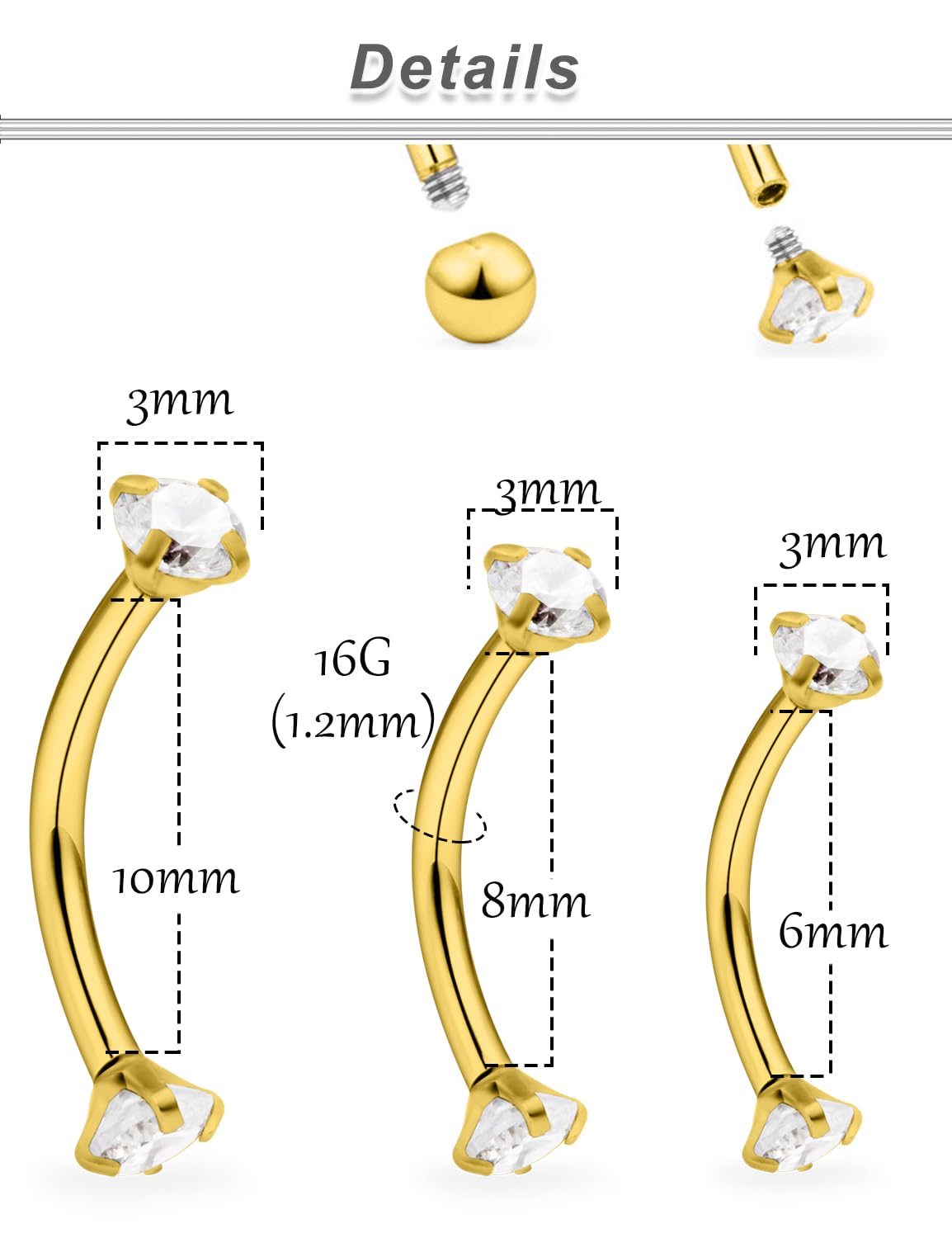 Gold Rook Piercing Jewelry Size Specification: 16G=1.2mm, Bar Length are 1/4"(6mm),5/16"(8mm) and 3/8"(10mm),Balls Size are 3mm .