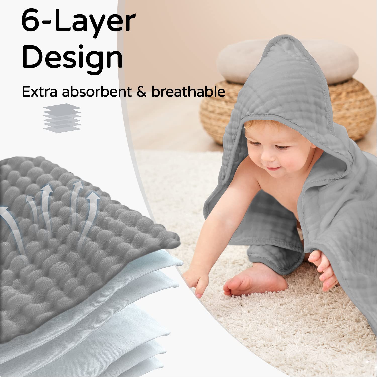 [Excellent Durability] - The 6 layers thickness muslin design is long-lasting enough for everyday use. Sized in 32 x 32 inches, the hooded baby towels are suitable for newborns, infants, toddlers, and small kids up to 3 years old.