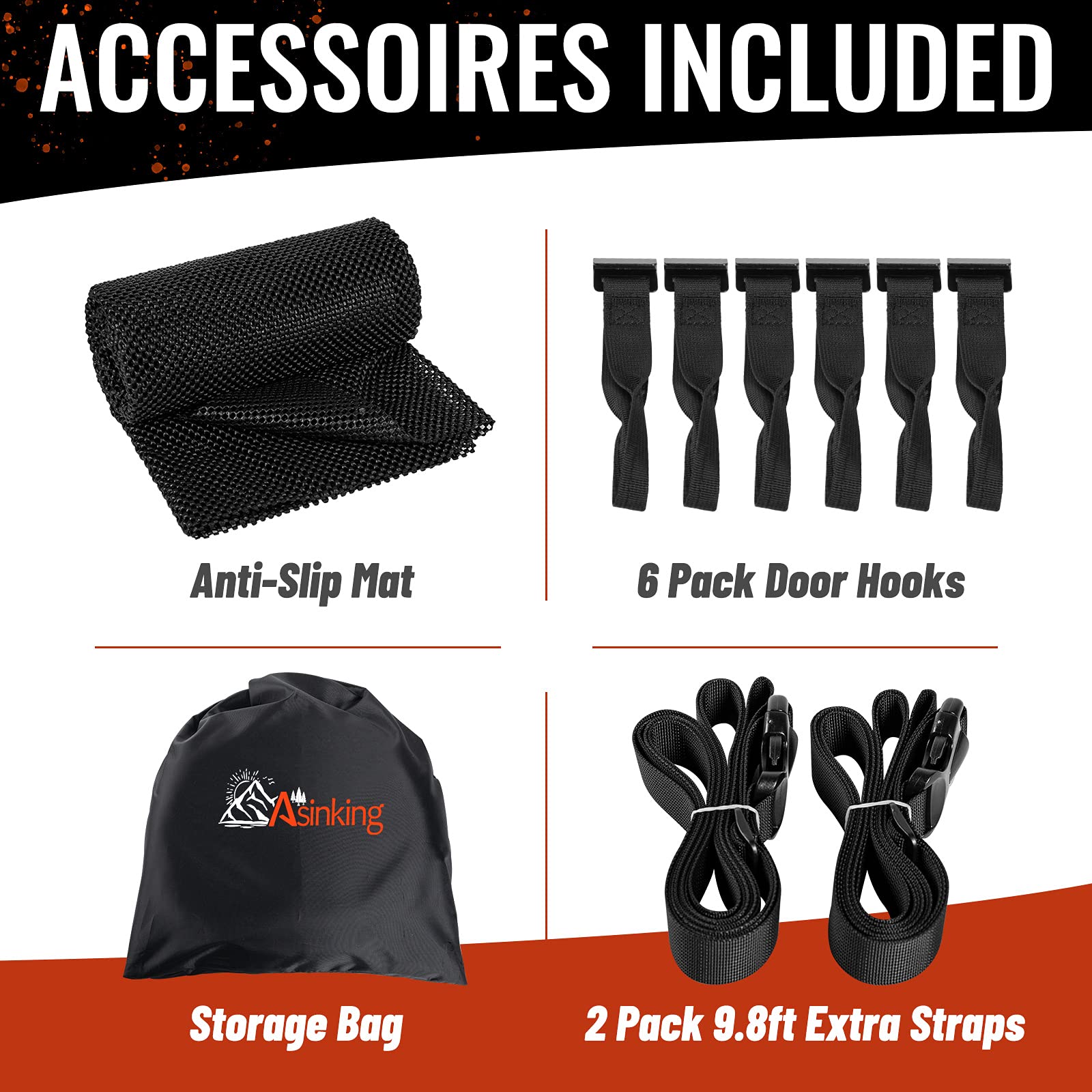 【PACKAGE LIST】You will receive 1x roof top carrier bag, 1x storage bag, 1x anti-slip mat, 6x padded door hooks, 2x extra luggage straps, 1x luggage lock.