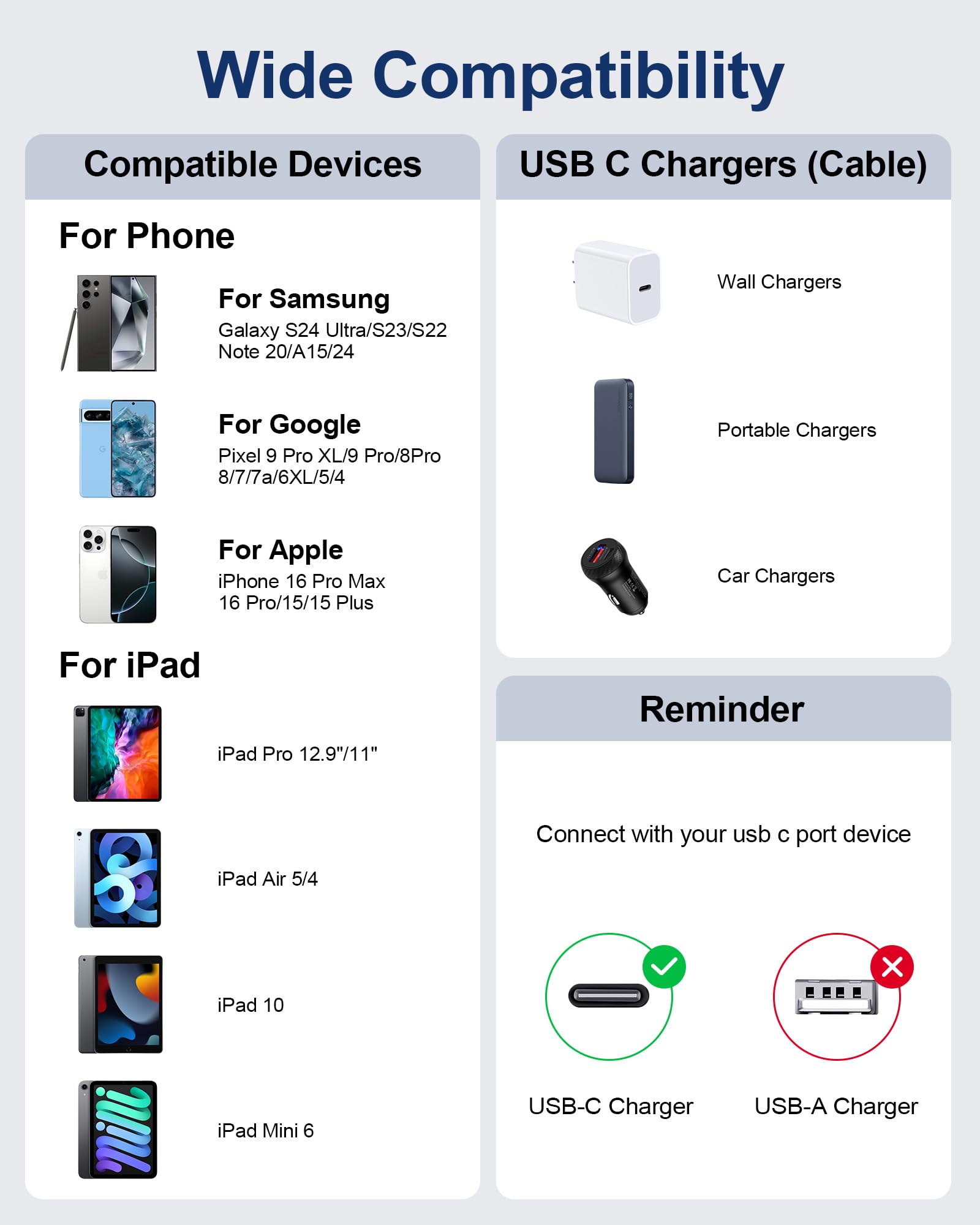 【Universal Compatibility】: iPhone 16e fast charger provides high-speed charging for Type-C smartphones, tablets, and laptops, including iPhone 17, 17Pro Max, Air, 17 Pro,16, 16e, 16 Pro, 16Pro Max, 16 Plus, iPhone 15, 15 Pro, 15Pro Max, 15 Plus, iPad Pro 13''/12.9'' 6th 5th 4th 3rd gen, iPad Pro 11'' 4th 3rd 2nd 1st, iPad Air 13''/11'', iPad Air 5th 4th, iPad Mini 6, iPad 10, Galaxy S24, S23 Ultra, S22, S21, A15, A14, A54, A55, Pixel 9 Pro XL, 9, 9Pro, 8, 7 Pro, 6a and any USB-C device