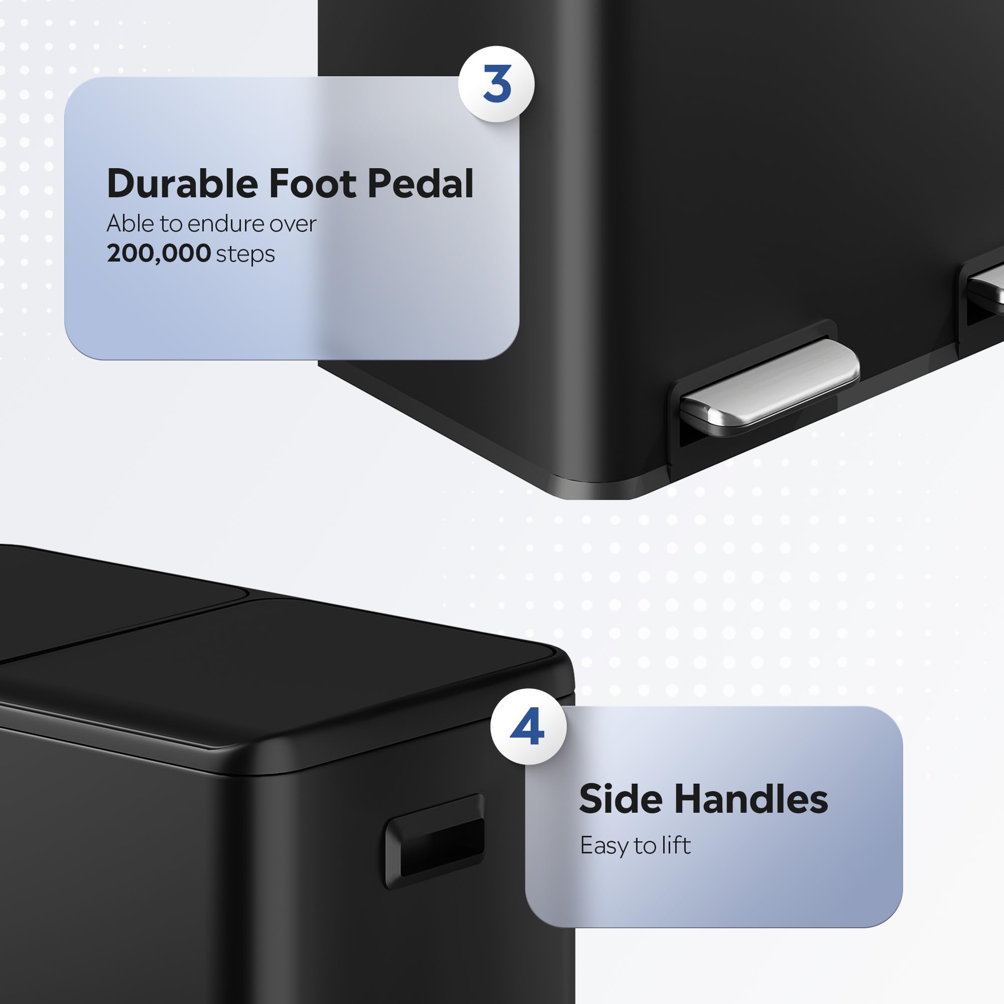 【Sturdy Packaging & Reliable Warranty】The dual trash can is protected with reinforced, five-ply (K5) 200-lb corrugated packaging, featuring molded foam padding on top and bottom to prevent dents, scratches, or crushing during transit. We offer a full one-year warranty covering shipping damage, parts failure under normal use, and any functional issues—simply contact our customer service for prompt assistance or replacement.