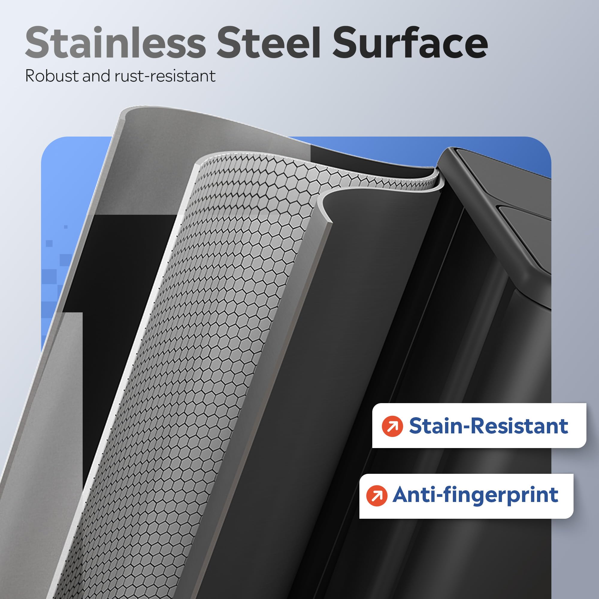 【Premium Stainless Steel Material】Engineered for lasting beauty and strength, our dual compartment kitchen trash cans are crafted from commercial-grade 410 stainless steel. This material provides exceptional rustproof strength, scratch resistance, and a fingerprint-resistant finish that maintains its lasting luster with a simple wipe. Coupled with two polypropylene inner buckets that effectively repel stain, ensuring a clean and fresh kitchen environment.