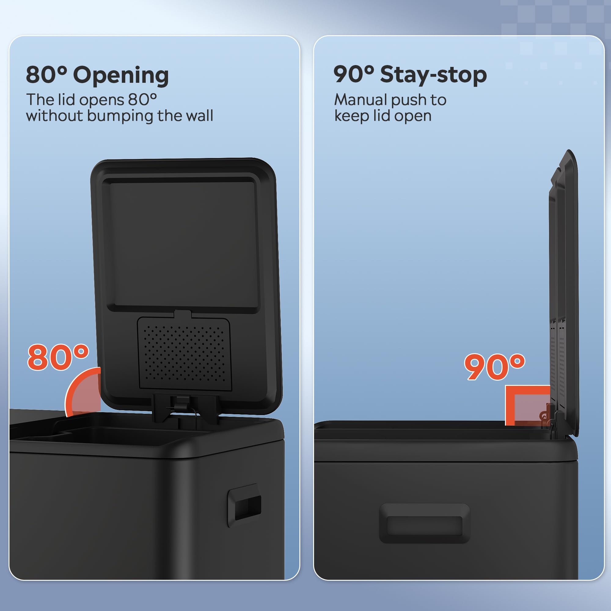 【Hands-Free Step-On Pedal Operation】Designed for convenience, the ergonomic stainless steel foot pedal allows effortless, hands-free opening with a durability of over 200,000 uses. The lid opens to 80° without colliding with standard kitchen islands and locks at 95° for seamless disposal during cooking or cleaning.